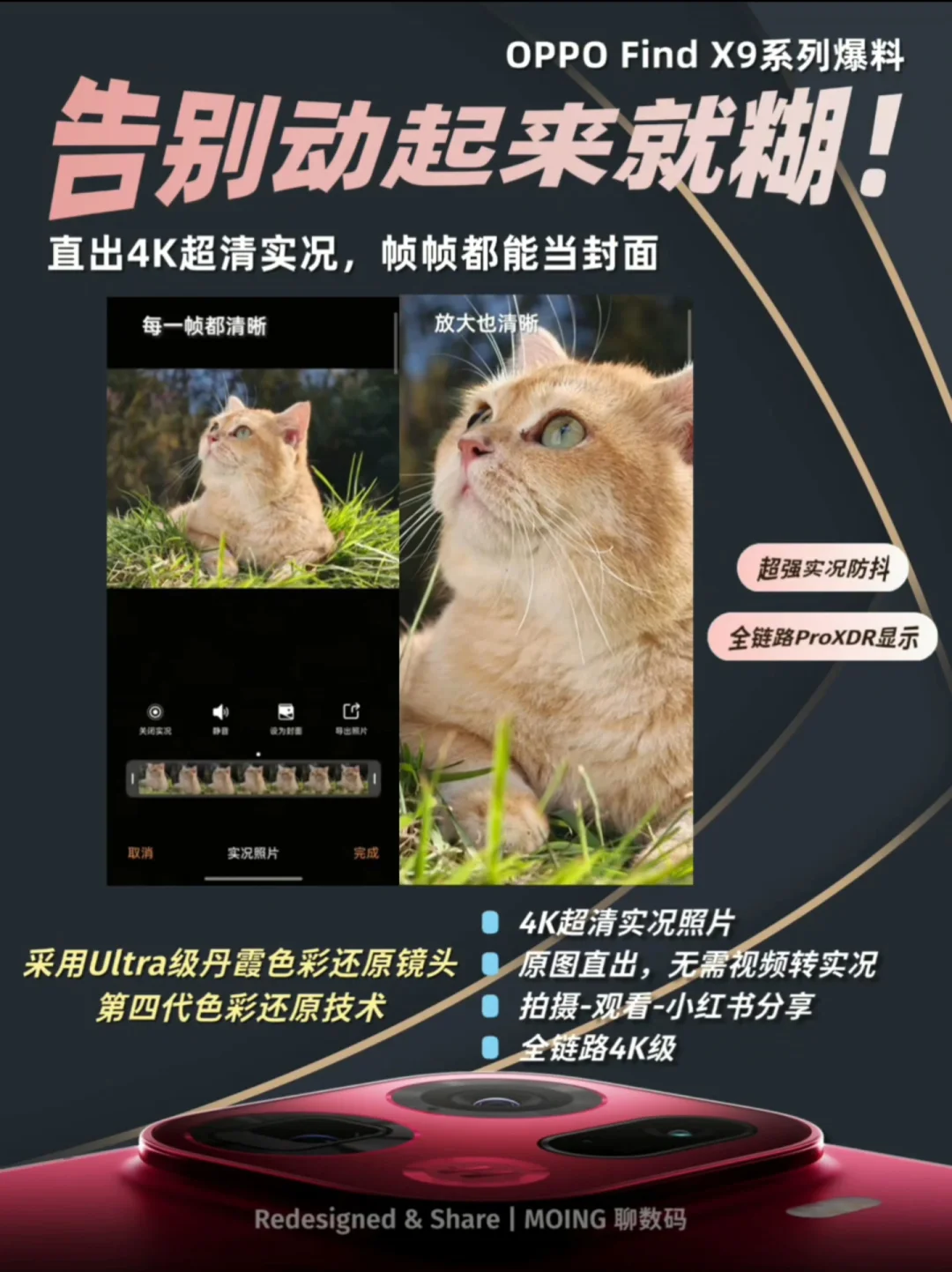 ✅ 但Find X9系列直接上了「直出4K超清实况照片」,清晰度比传统的提升了400%! 意思是,3秒视频里的每一帧都清晰到能当封面!放大看细节也不糊!