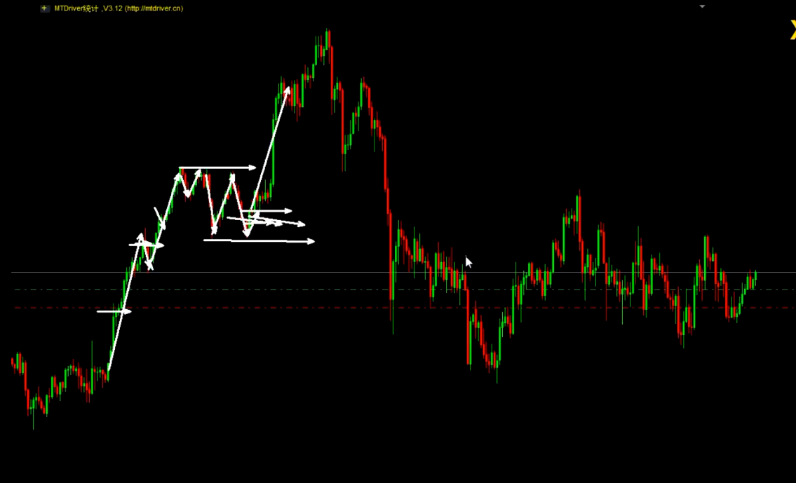 价格不断创新高就是上涨趋势。为什么一定要在支撑位置做多,因为上涨趋势回调后重新到前高,那里有抛压,抛压也是压力,不要在压力位置坐多价格不创新高也不创新低就是震荡,震荡不做,等突破。