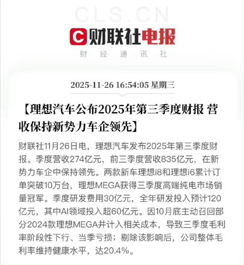 理想汽车Q3财报理想汽车核心优势显著:智驾技术稳居行业第一梯队,全栈自研端到端+VLM双系统,覆盖全场景零接管行驶,AEB等安全性能领先,用户选装率高。纯电布局成果突出,i8、i6订单超10万,全系支持5C超充,补能效率行业顶尖。充电网络规模领先,自建超充站超3500座,贯通高速干线、覆盖260+城市,构建“10分钟充电生活圈”。渠道与服务完善,全国布局500余家零售及售后中心,家充+超充多场景补能适配,搭配无感结算等便捷体验,形成技术、产品、基建协同的核心竞争力。