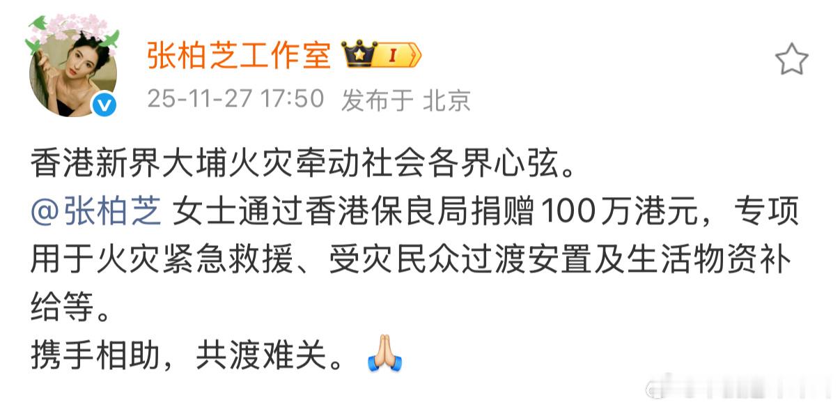 张柏芝为香港火灾捐赠100万元港币,大美女人美心善!