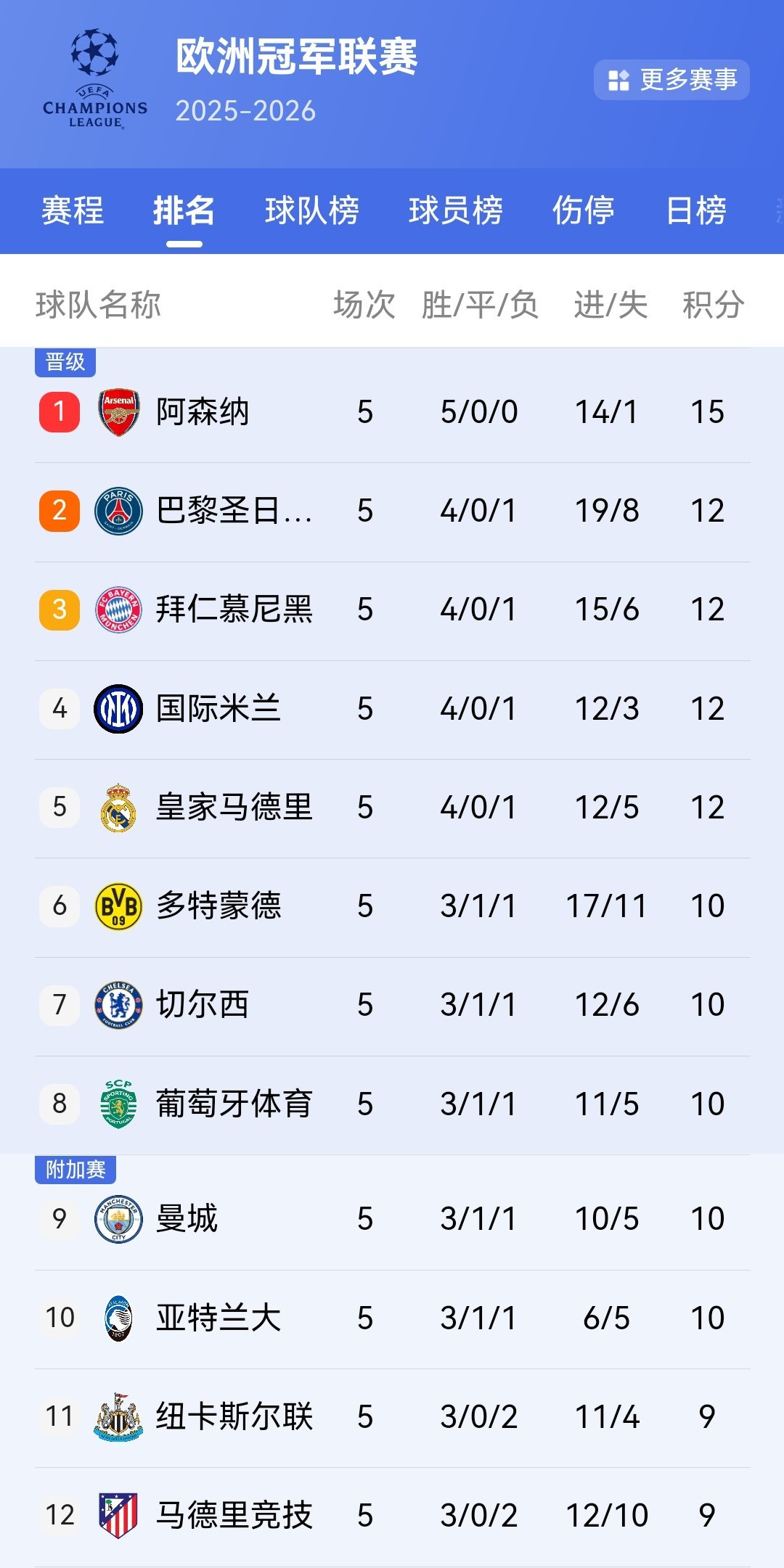 欧冠积分榜:阿森纳全胜3分领跑,巴黎拜仁国米皇马同分分列2-5名欧冠阿森纳11