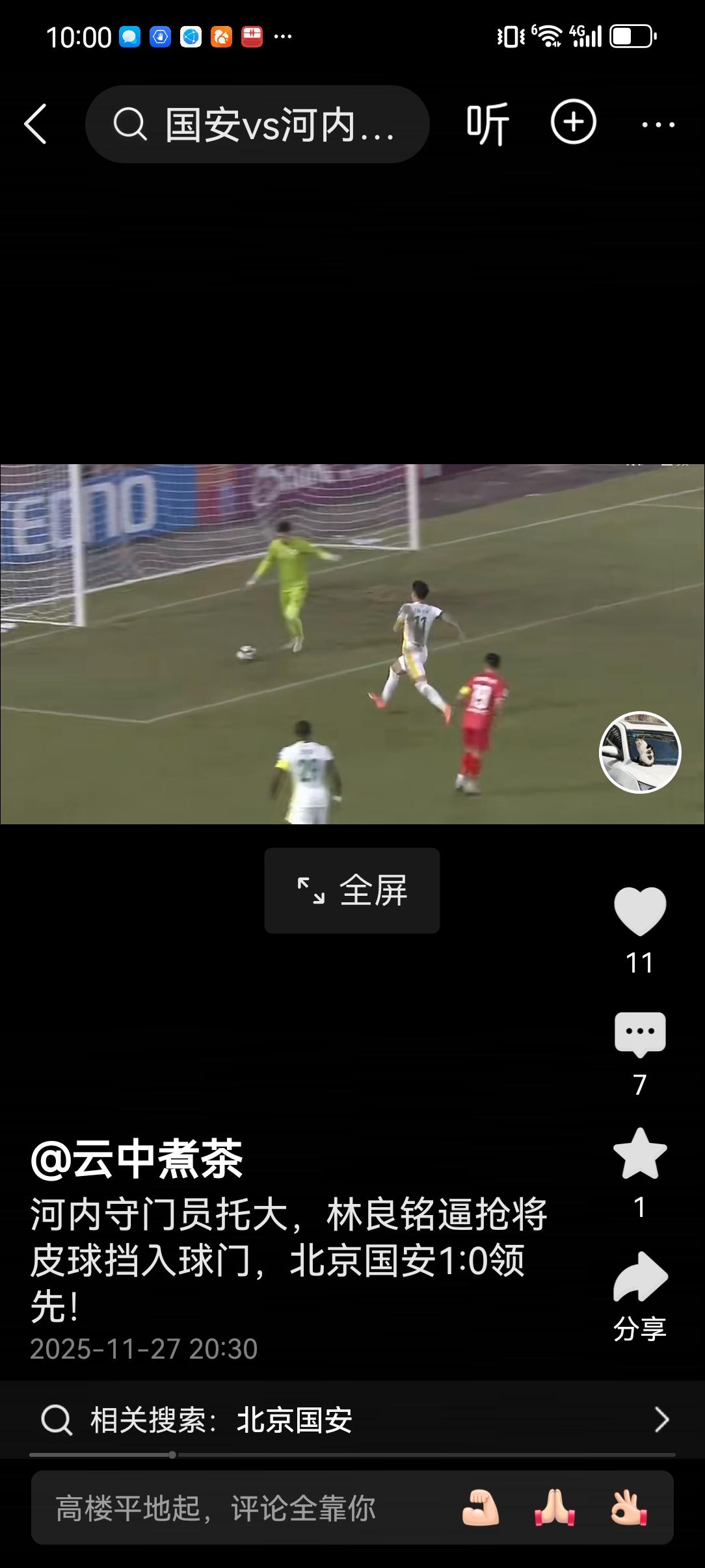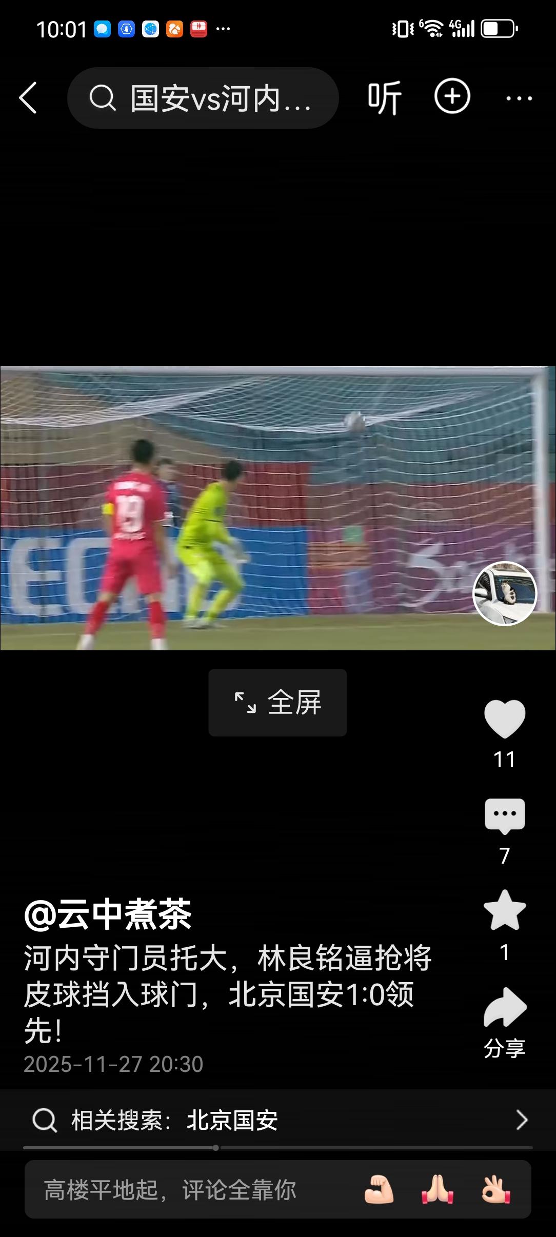 国安亚冠闪电破门,对方球门懵圈送大礼,咱林皇怎不欣然与笑纳。国安队今天晚上在一场亚冠的比赛中,来到了越南公安的主场,进行了一场势均力敌的比赛。开场之后,公安队显然是想利用主场的优势之环境,想一口吃下国安队。很快,也打的很有针对性。国安队这边也是见招拆招,得球之后就打反击,10分钟左右,林良铭上抢,对方门将一个解围,球踢到林良铭腿上,反弹进了自家队球门之内,1比0,比分保持到上半场结束。下半场张玉宁替下法比奥,下半场进行到55分钟左右,恩加德乌踢呲,球打对方身上也来个反弹,幸好万幸打中立柱,国安逃过一劫。塞鸟啊,近70分钟时,单刀面对对方门将没有传队友,一个挑射飞出横梁,可惜可惜,实在是太可惜了。方昊,曹永竞同时登场,不多时李磊,柏杨也披挂上阵了。就差主力门将了啊,张玉宁啊,又一个单刀没进,二次进攻击中门柱。浪费机会必定会受到惩恶的,我们没进球,越南公安队在国安队禁区内混乱之中,张源解围打到对方身上,反弹,这次是真的来了个反弹,皮球滚进国安队球门的了。89分钟,越南公安队久攻之下,终于又有斩获,右路转左路,左路传中,中路一个垫射,2比1,越南公安队反超。踢球不甚规范的曹永竞补时阶段红牌被罚下了,比赛也就此结束了。怎么说呢,是一场鲜有主控配合的一场比赛吧,昏昏沉沉的90分钟的比赛。方昊还是那方昊,呆头呆脑生硬无比的横冲直撞的踢球方式,怎么好啊,踢球不秀气也就算了,怎么这还一直都那么愣愣磕磕的不上道啊!