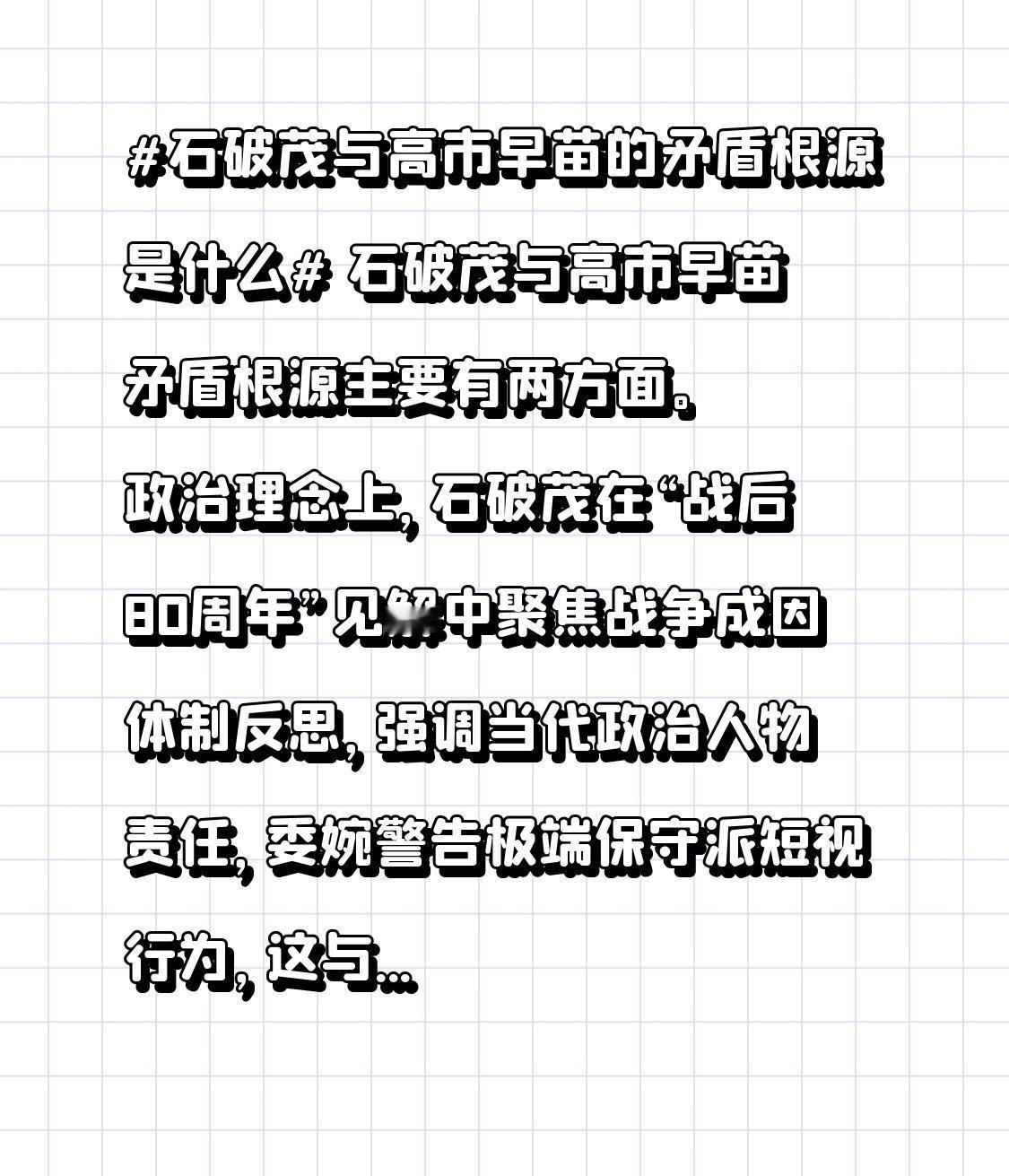 石破茂与高市早苗矛盾根源主要有两方面。 政治理念上,石破茂在“战后80周年”见解中聚焦战争成因体制反思,强调当代政治人物责任,委婉警告极端保守派短视行为,这与高市早苗等极端保守派政客近年政策倾向相悖。 外交态度上,高市早苗发表涉台错误言论破坏日中关系,石破茂等理性声音批评她,这惹恼了维护高市早苗的日本右翼分子,他们煽动网暴石破茂,也加剧了两人矛盾。说白了,就是理念和立场的差异让他们站到了对立面。