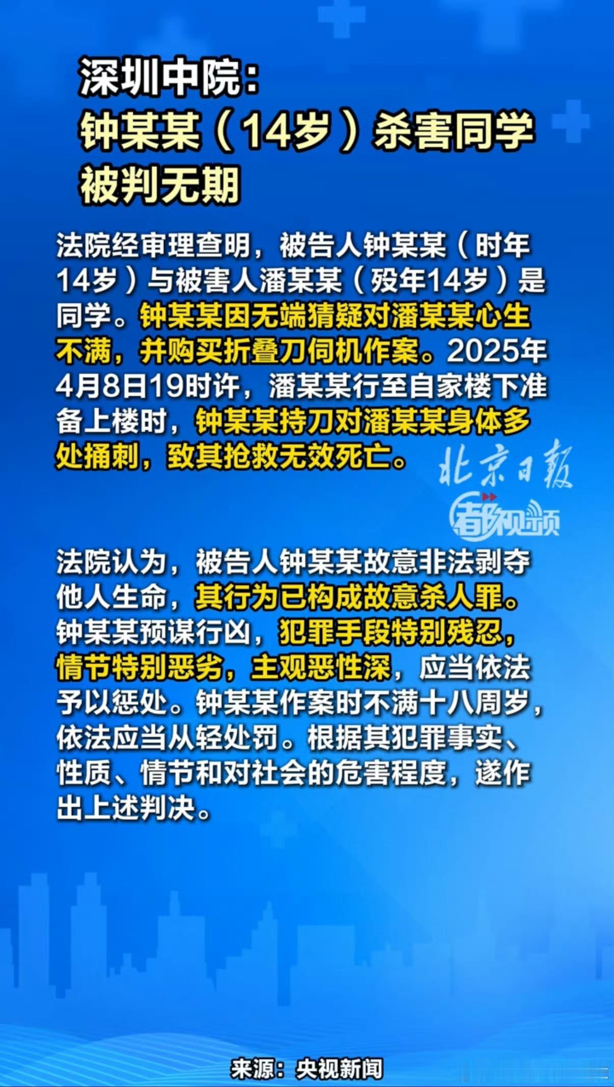杀害14岁女同学的14岁男生钟某某被判无期, 无期虽是顶格惩罚,但在下尚有两点疑问: 一是钟某某作案前尚知搜索“14岁杀人刑责”且网购毒药未遂,那么他肯定清楚法律漏洞并蓄意利用,主观恶性远超生理年龄,判死刑并不为过。 二是法院因未成年最高量判处他无期徒刑,可无期尚有可能减刑缩至10-15年,而潘某某父母早早生了白发,潘某某生命则永远定格于14岁,不知是否附加“不得减刑”条款? 最高法、最高检曾明确表态:“对于主观恶性深、情节恶劣的未成年人犯罪,绝不姑息”。 法律本应是正义的标尺,而非恶魔的避风港。钟某某蓄意钻法律空子、手段残忍到连补刀都毫不手软,主观恶性早已超越年龄边界。 顶格无期若能随意减刑,“绝不姑息”便成了空喊的口号。潘某某的14岁永远停在那28秒,而施暴者却可能在十几年后重获自由——没有“不得减刑”的约束,这场判决,到底欠受害者一个真正的公道。