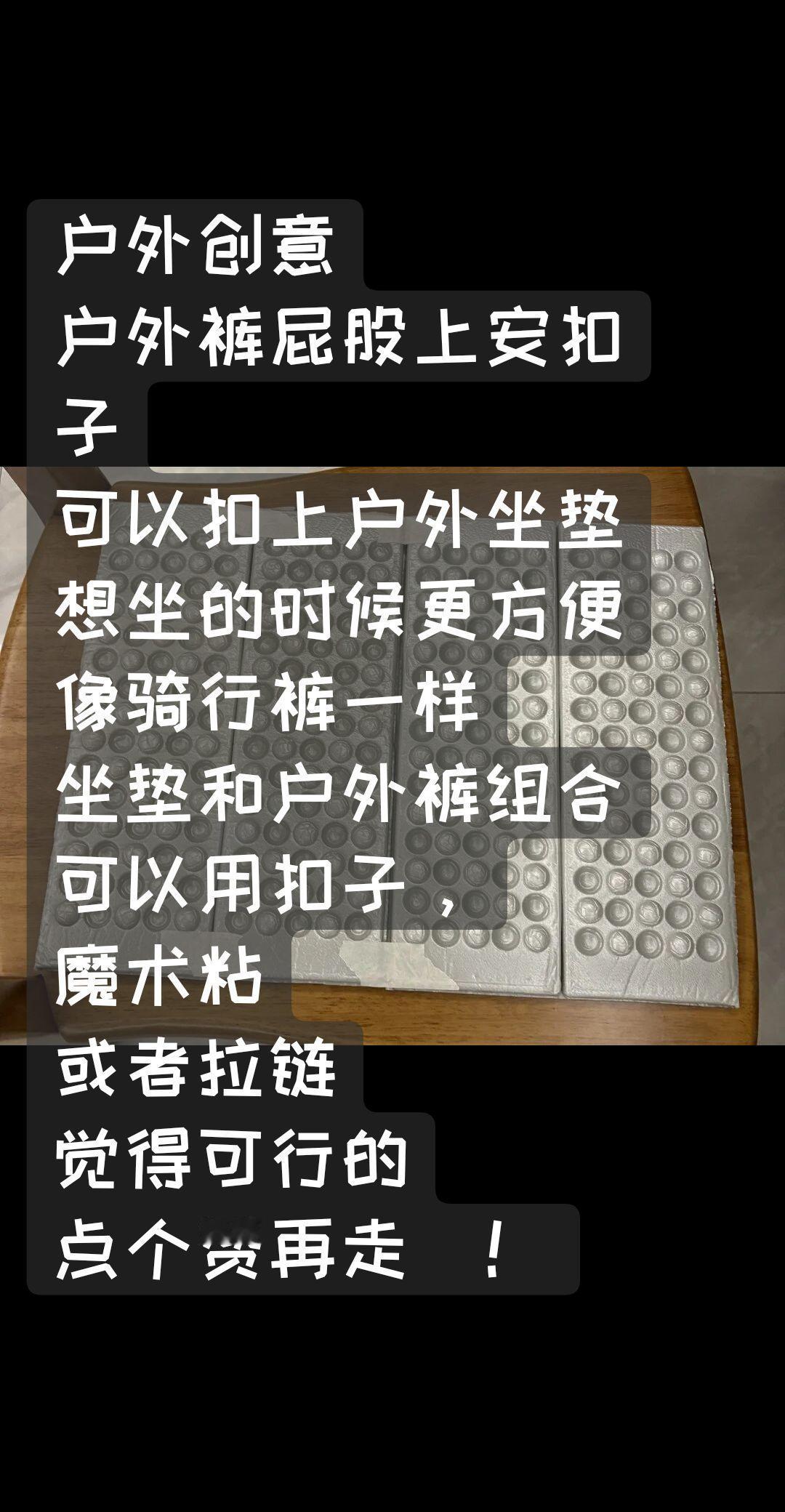 户外创意(1)户外创意 户外裤屁股上安扣子 可以扣上户外坐垫 想坐的时候更方便 像骑行裤一样 坐垫和户外裤组合 可以用扣子, 魔术粘 或者拉链 觉得可行的点个赞! 户外坐垫 户外裤 创意设计 山野