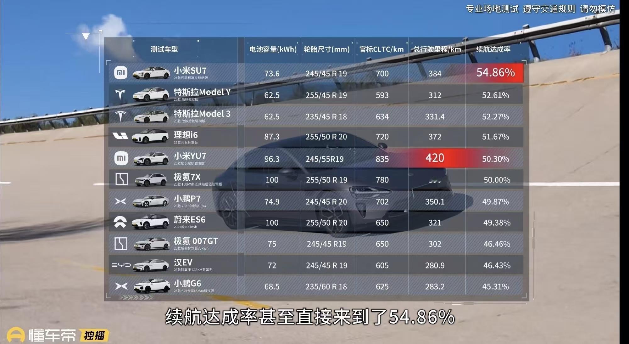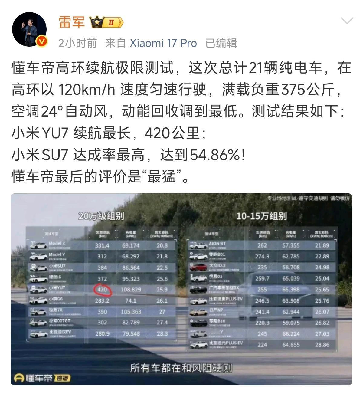 雷军回应小米汽车续航测试雷总再次回应小米汽车续航测试,小米SU7、YU7 分别拿下续航达成率第一、续航第一,小米汽车北方车企的基因在此刻已经尽数体现了小米汽车从立项之初就非常关注续航,所以你能在小米SU7上看到一版又一版迭代的电控水平,让SU7做到了最高的续航达成率;而小米YU7则凭借大电池“力大砖飞”,拿下续航第一的水平。懂车帝的测试场景是高环120,非常能考验整车电控、空气动力学和能量管理能力。一些网约车高速上不敢跑快就是怕续航掉太快,而小米汽车没有任何相关的顾虑。为什么小米汽车在各项测试中排名都很高,还有一堆人天天扣小字尬黑?值得我们思考。。。