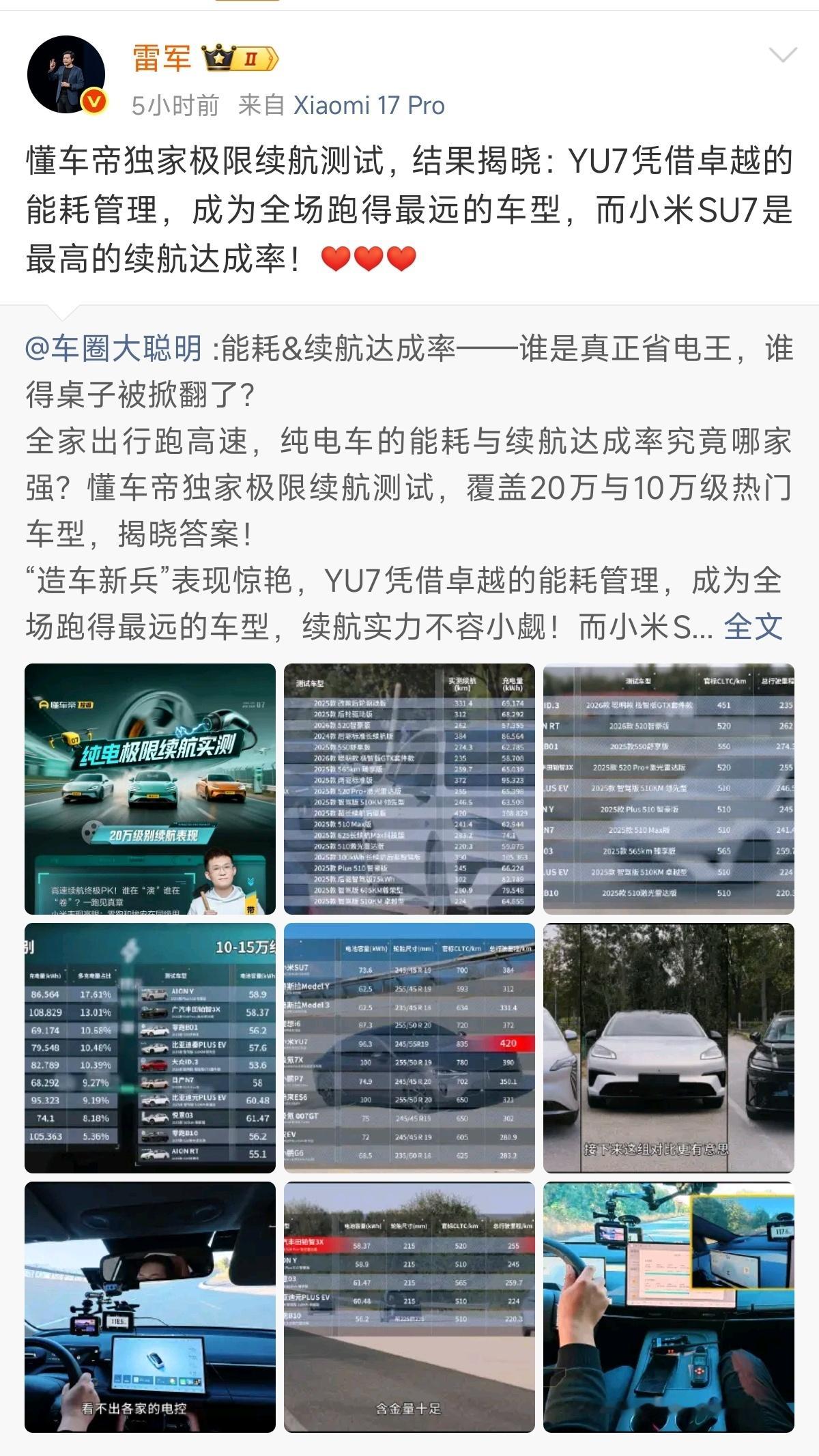 雷军回应小米汽车续航测试雷总再次回应小米汽车续航测试,小米SU7、YU7分别拿