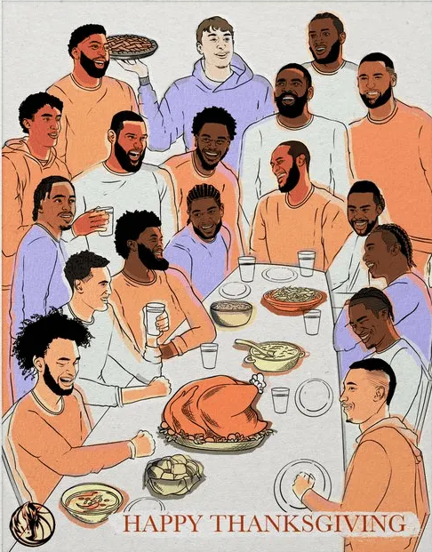 独行侠官方更新动态,晒出一张画有全员的肖像画。 图片中,独行侠球员们正在吃感恩节晚餐,餐桌上还有火鸡。 本赛季,独行侠取得5胜14负,排名西部第14。