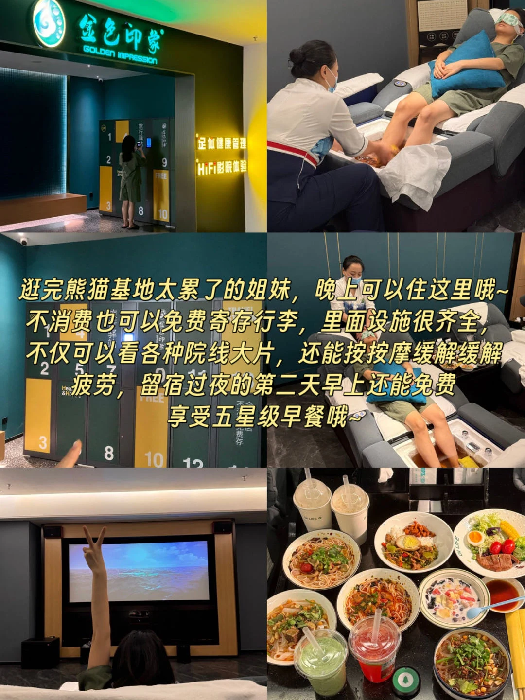 金色印象:逛完熊猫基地太累了的姐妹,晚上可以住这里哦~不消费也可以免费寄存行李,里面设施很齐全,不仅可以看各种院线大片,还能按按摩缓解环节疲劳,留宿过夜的第二天早上还能免费享受五星级早餐哦~