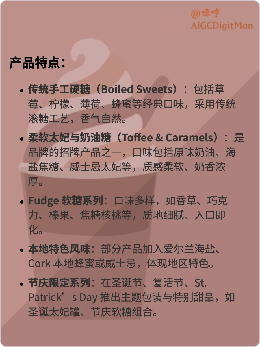 品牌以制作经典爱尔兰传统糖果为特色,包括太妃糖、硬糖、软糖与巧克力点心等,深受本地家庭与游客喜爱。