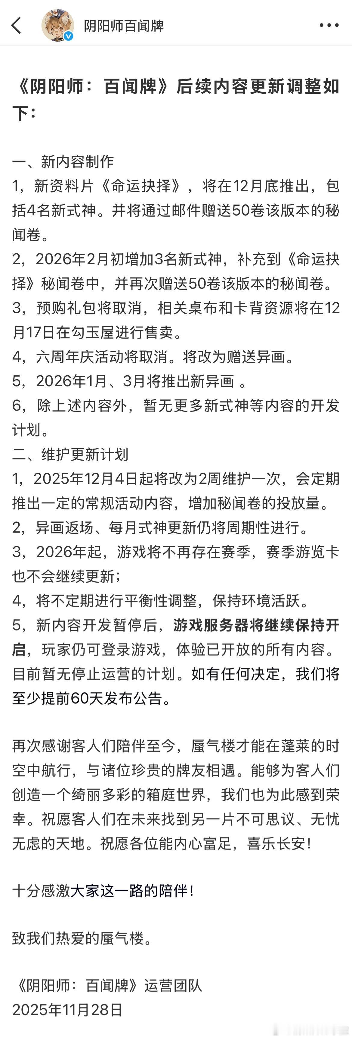 《阴阳师:百闻牌》将于2026年1月1日起停止新内容开发,服务器仍保持开启,玩家