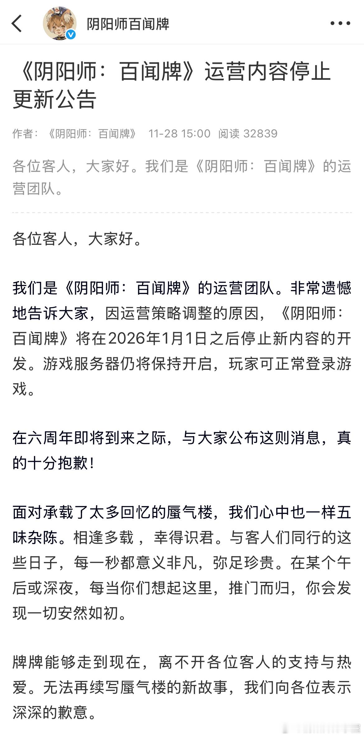 《阴阳师:百闻牌》将于2026年1月1日起停止新内容开发,服务器仍保持开启,玩家可正常登录游戏。