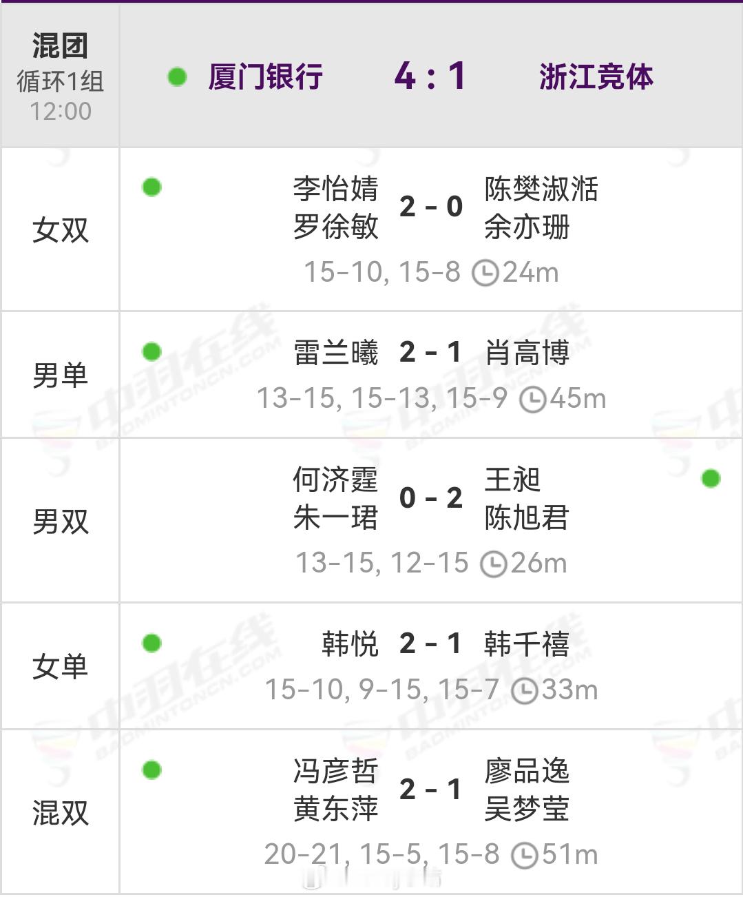羽超联赛第二轮厦门银行4比1浙江竞体厦门银行4比1浙江竞体凤凰组合2比1廖品