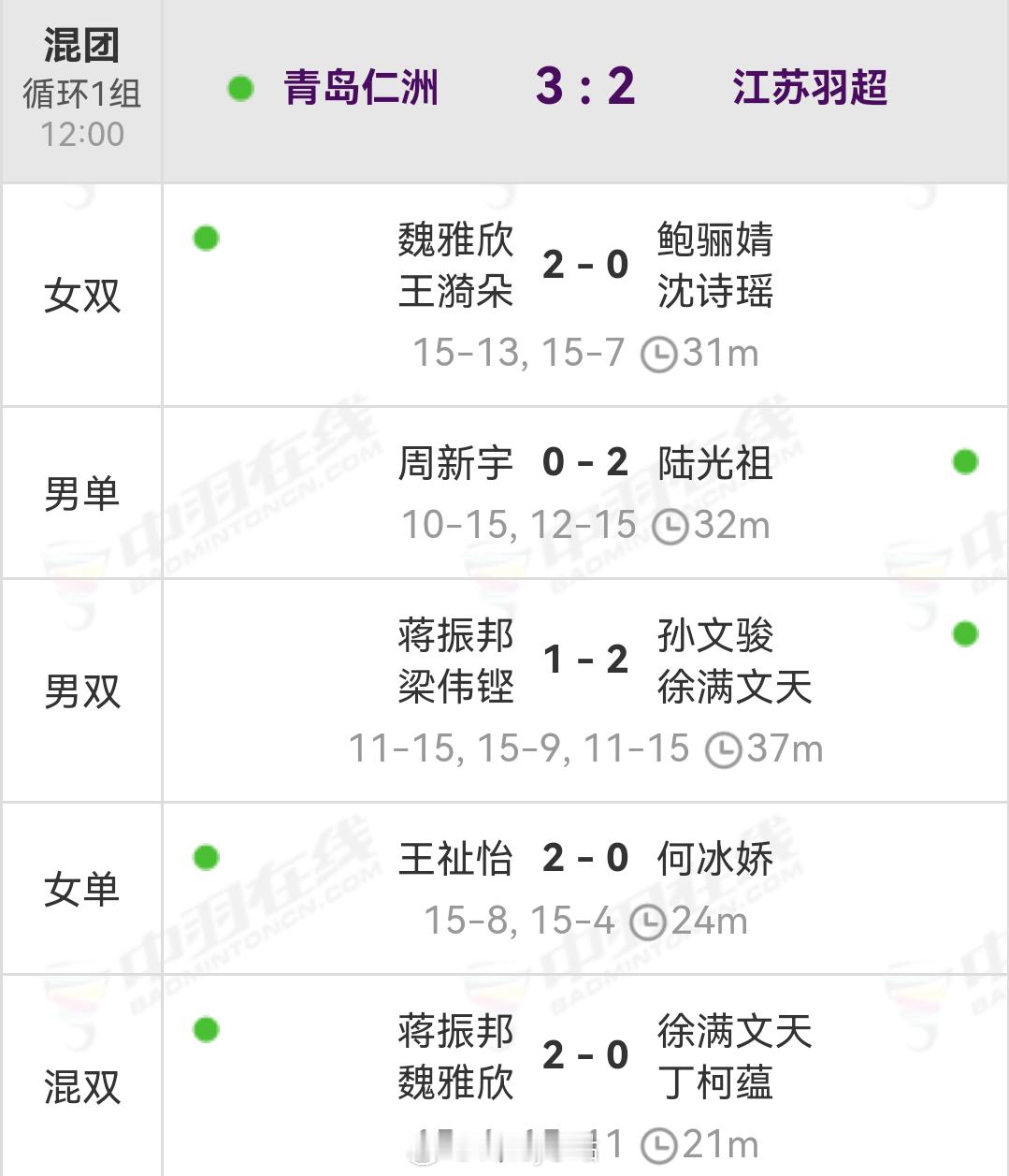 羽超联赛第二轮青岛仁洲3比2江苏羽超青岛仁洲3比2江苏羽超振欣组合2比0徐满文