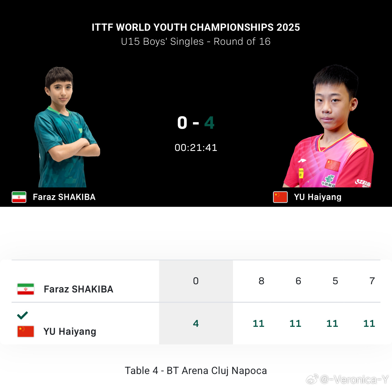 2025世青赛U15男女子单打16-8刘子菱1-4库拉帕斯尔于海洋4-0夏克巴刘子菱的混双也输给泰妹了所以国乒现在打不过泰妹