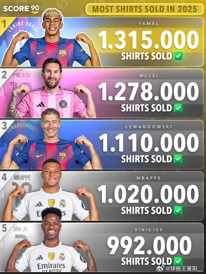 2025年球衣销量榜:亚马尔131.5万居首,梅西次席,C罗第七体育巴萨