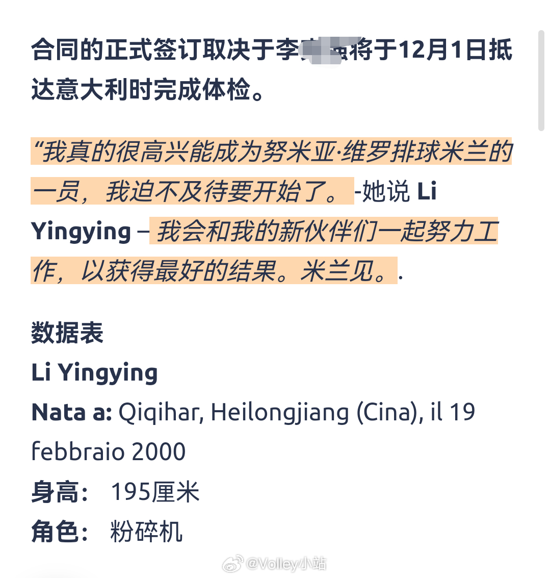 据意大利媒体报道,李盈莹将于12月1日抵达意大利,届时通过体检后正式签署合同排坛动态米兰官宣李盈莹加盟
