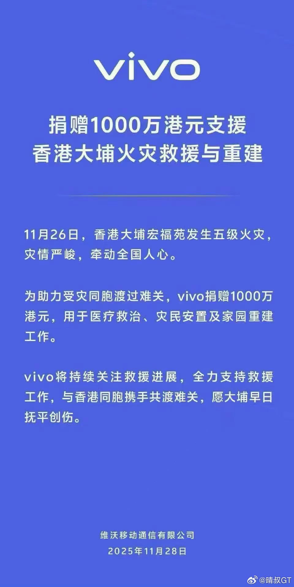 vivo捐1000万港元支援香港vivo
