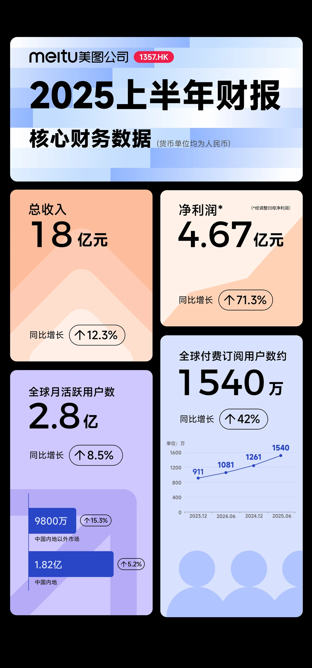 再炫的AI概念,最终得看 “主业赚不赚钱、用户离不离得开”。截至年中,美图付费订阅用户数达约1540万创历史新高,同比增长超42%。这直接反映在财报业绩,归母净利润4.67亿元,同比增长71.3%。
