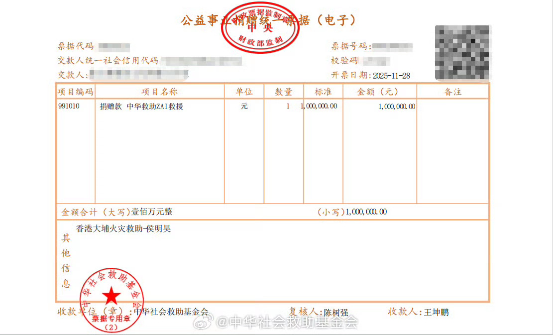 侯明昊通过中华救助基金公会为香港捐款100万!希望同胞们尽快渡过难关!明星捐款侯明昊为香港捐款100万