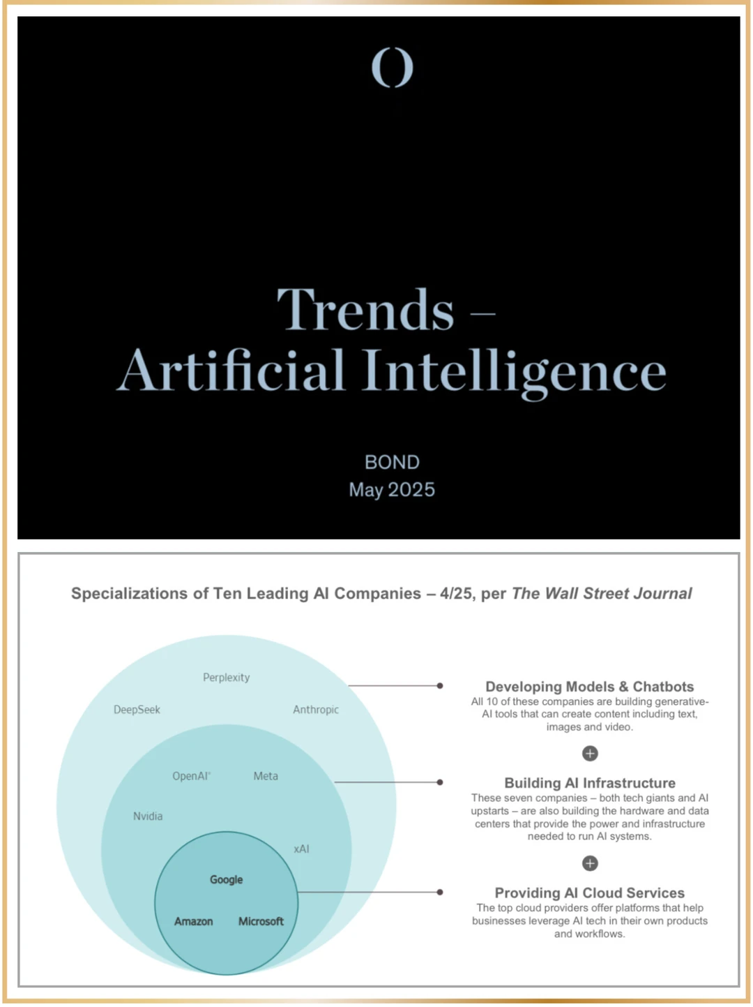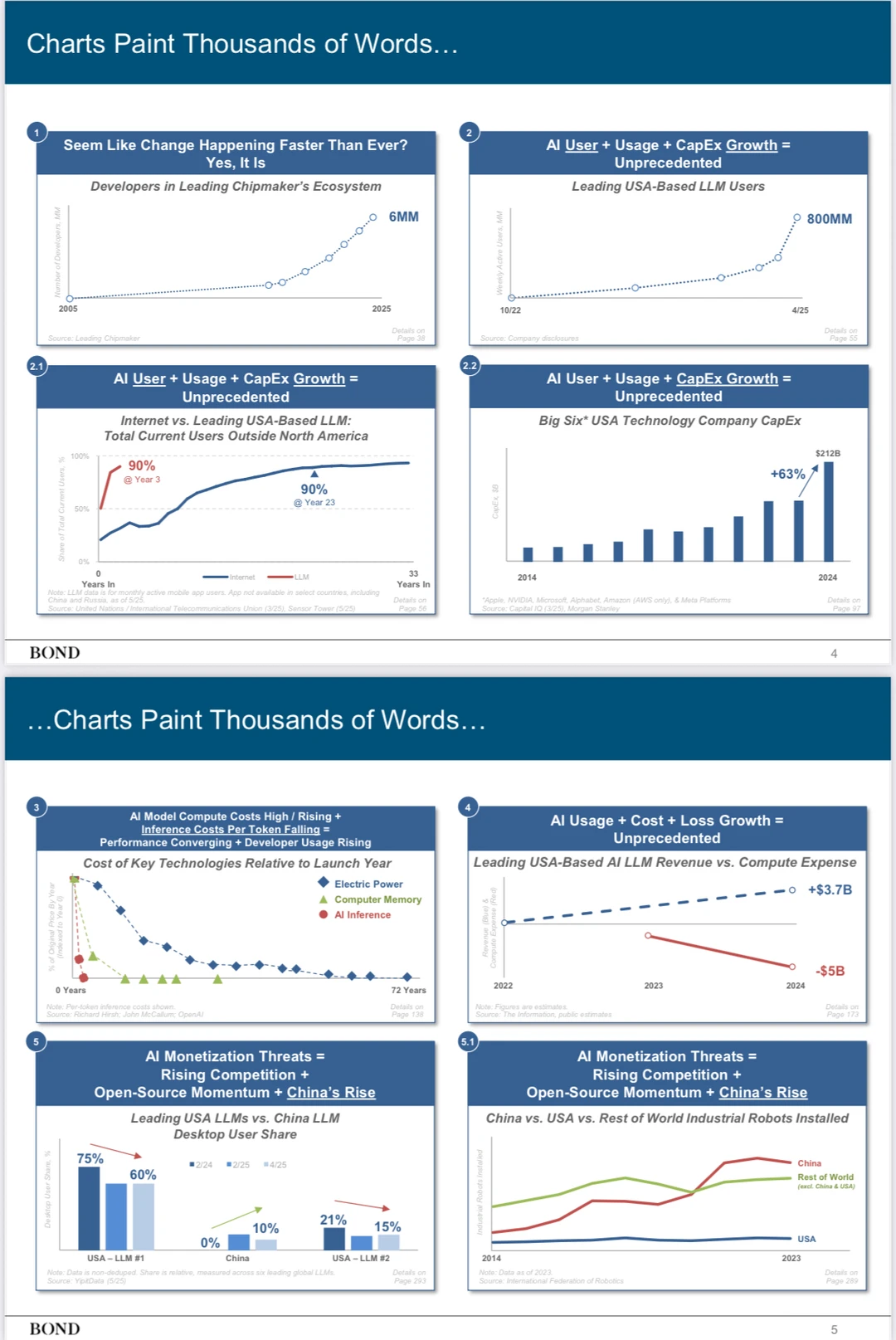 Bond Capital写的,340页,非常全面,最重要的是实效性很好,5月30日截稿,很多信息都是最新的,涵盖了非常多的热点话题和观点。 我在附图中总结了一些报告的重要观点,但并不全面,大家可以酌情参考。如果有需要原始资料的同学也可以私信我,谢谢。