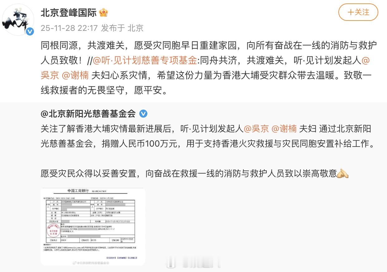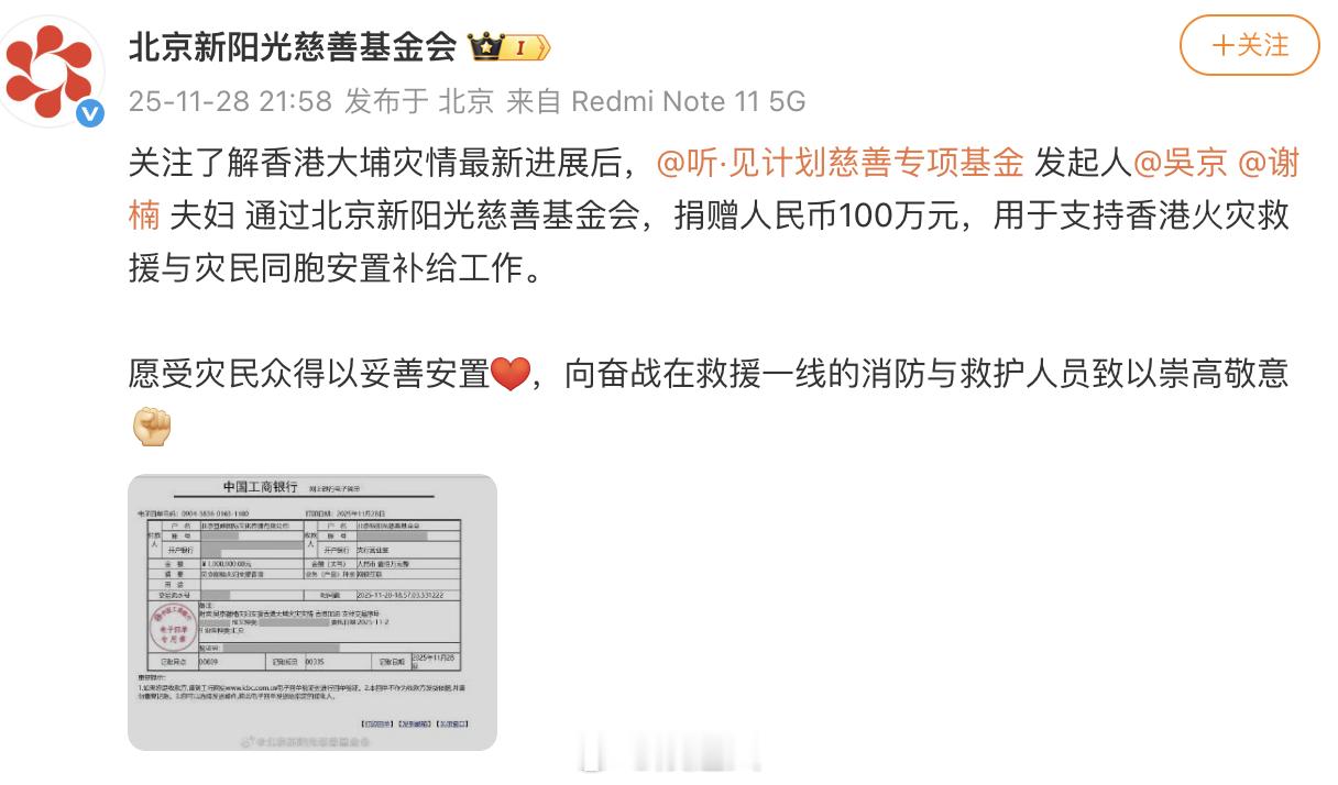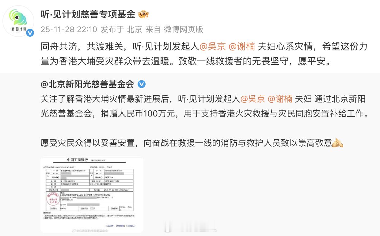 吴京谢楠捐款香港100万 听·见计划发起人吴京谢楠通过北京新阳光慈善基金会,捐赠人民币100万元,用于支持香港火灾救援与灾民同胞安置补给工作。用自己的力量为灾区助力,把善意与帮助默默地落到实处。吴京谢楠向香港捐款100万元