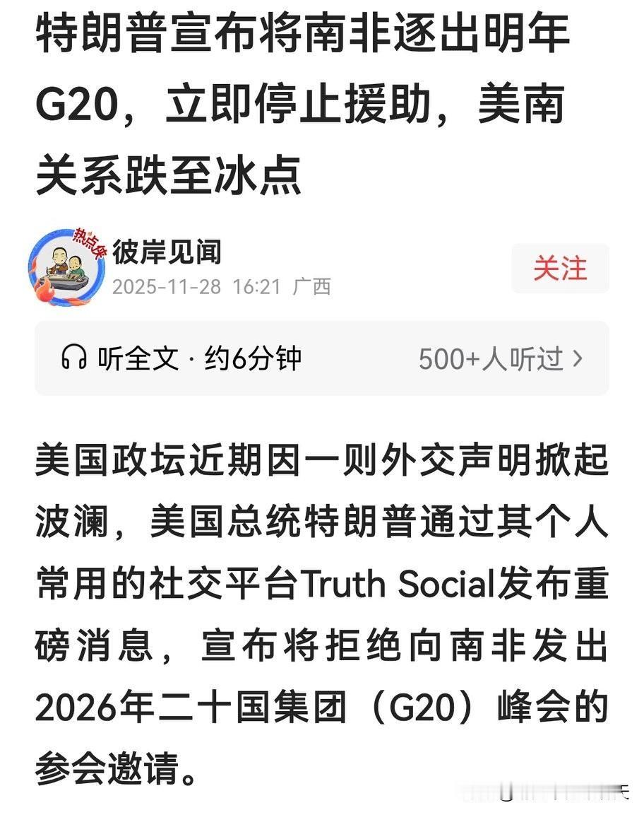 老特果然是睚眦必报,绝不含糊。 早看你拉马福萨不顺眼了,敢欺负白人不说,还敢在劳资不在场的情况下通过劳资不爱听的声明,这面子,你可是一点都不给哟。 这关系搞僵了,拉马明年可能去不成G20了,这门别人已经关了,进不去了。 算鸟,以后还是和金砖兄弟混吧,这活人还能被尿憋死?