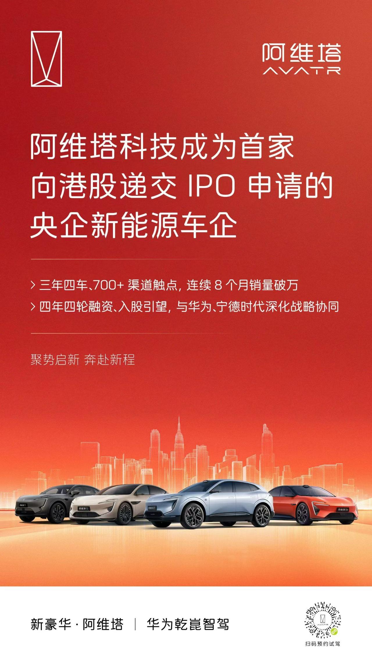 首家向港股递交IPO申请的央企新能源车企!! 阿维塔递交港股IPO申请! 三年四车、连续8个月销量破万 四年四轮融资,累计募集资金超190亿; 115亿入股引望,成第二大股东 战略深化,与华为、宁德开辟新纪元 全球布局,覆盖30+国家和地区、布局700+渠道触点