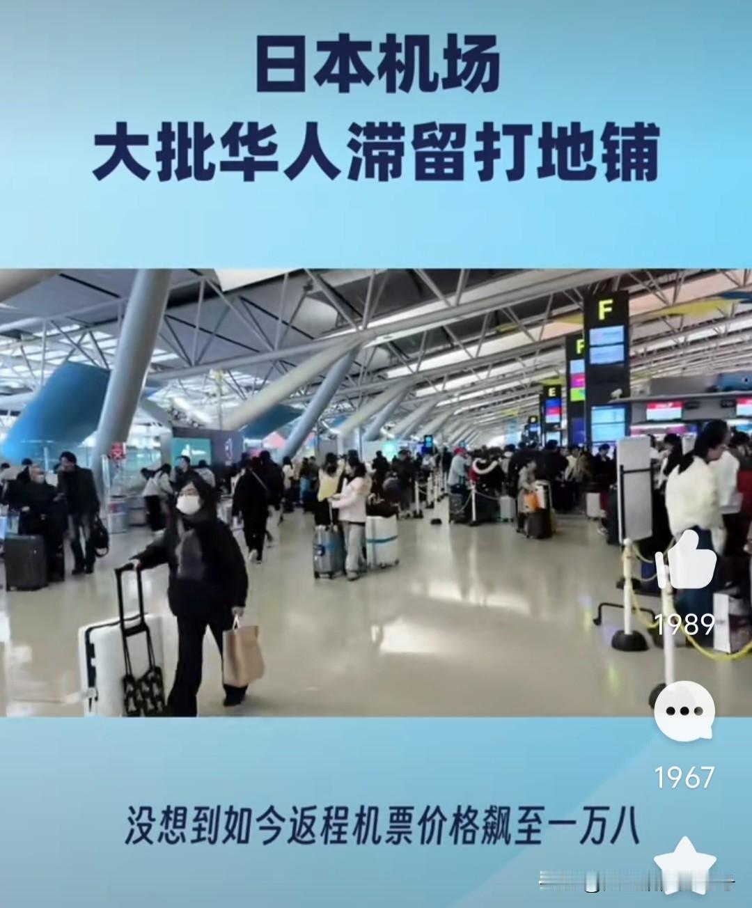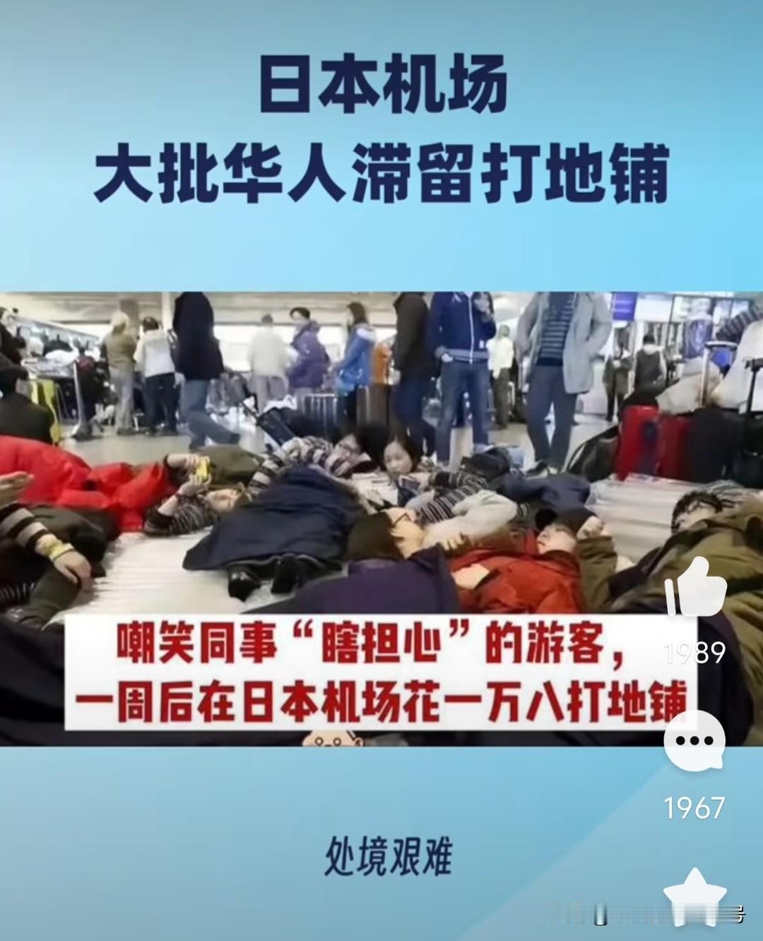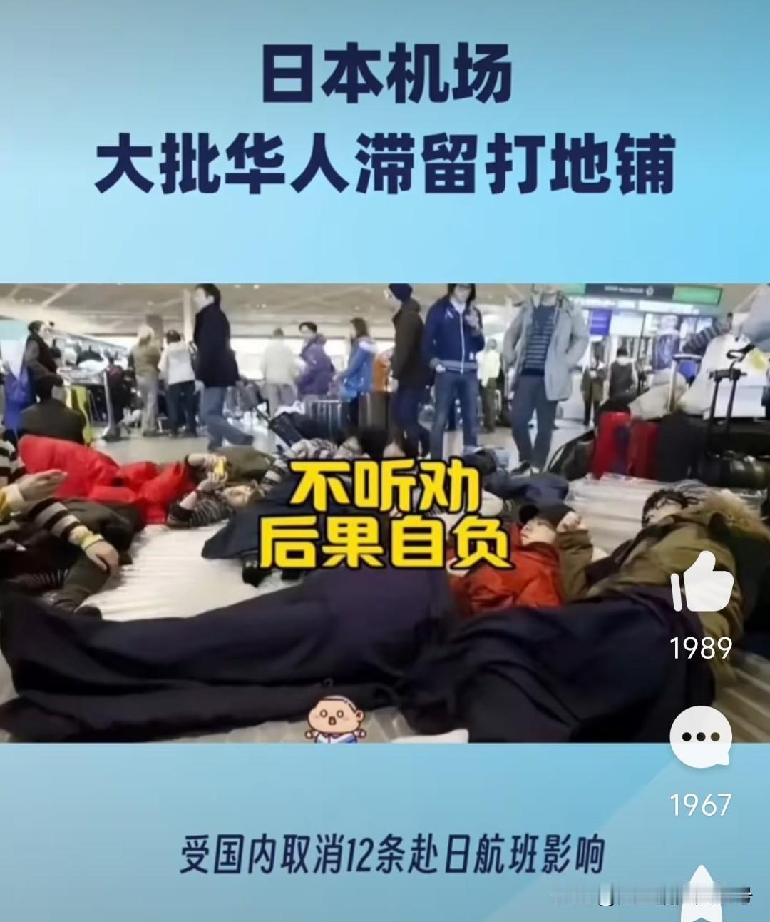 不听劝!赴日中国游客机场打地铺! 由于许多到日本的航班取消,近期赴日的中国游客因买不到机票而滞留日本。 这些中国游客在日本机场打起了地铺 这些旅日中国游客大部分是外交部11月15日发布建议中国人避免去日本的警告后而去的。 这些人为什么无视外交部的警告还要去日本旅游? 更有甚者,竟然对劝告他们的人说“瞎操心”。 我认为这些人可能和日本人一样对当前形势产生了误判。 日本人挑衅中国,对于日本人对中国人所犯罪行及二战战败国的各项文字文件一概否认,主要是他们心中根深蒂固对中国人的优越感,他们认为中国人是不敢打日本本土的,一千多年来,只有日本人来中国烧杀劫掠,而中国军队从未到过日本本土。 而这些赴日游的中国人对于外交部的警告置若罔闻,主要是他们心里百分之一万的赌定中国不敢也不会攻击日本本土,他们认为日本本土无比安全,在这一点上,他们的想法和日本人一样。 既然回不来,建议这些人加入日本籍,永远不要来了。