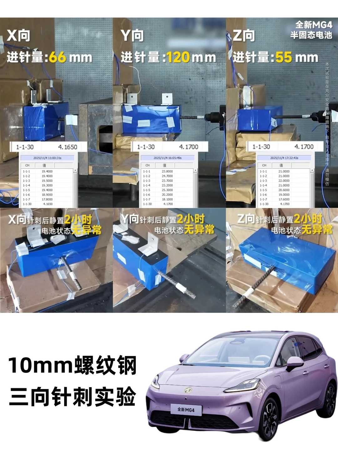 今天在广州车展,我亲眼见证了什么叫“车圈地震”⚡——MG重磅官宣MG4半固态版,下个月就开启交付了! 不是概念车,不是期货,是实打实能开走的量产车,起售价只要9.98万! 说实话,我们的第一反应是:MG这么搞是不是太“莽”了? 🔍为什么说半固态是下一代电池技术? 传统电车痛点无非两个:电池安全和冬季续航焦虑。半固态电池,几乎是为解决这两个问题而生的。 安全性能拉满,穿刺测试直接上“地狱难度” MG这次公开的实验视频里,用了直径1公分的螺纹钢,从X、Y、Z三个方向穿刺电芯,静置2小时——电芯不冒烟、不起火、不爆炸💥。 甚至还加码了单电芯挤压测试,在25万牛(能瞬间粉碎大理石)挤压下电芯“内脏”都挤出来了,连烟都没冒。 ❄低温性能打破行业天花板 我在北方试过不少电车,冬天续航打五折是常态。但MG4半固态版在-30℃环境下不加热直接充,动力输出不打折;我想,MG4半固态量产上车后,电车车主在东三省可以放心开了。 更让人震撼的是MG的“技术平权”理念 据说上汽为了研发半固态电池,布局20年,投入上百亿,团队里光是院士、长江学者这类国家级人才就有二十多人👨‍🔬,一年工资都要发掉上亿。 结果车价压到10万以内, 而更深远的是,MG正在做一件更重要的事: 把曾经高高在上的半固态电池,真正推向大众市场。这不是一次简单的技术发布,而是开启了“半固态普及化”的时代🔛。 当别家还在实验室里测试样品时,MG已经让普通人用10万块开上了量产车——这标志着半固态电池正式从“技术尝鲜”迈入“规模走量”的新阶段。 站在行业角度看MG的野心 MG作为全球百年品牌,在新能源领域的打法非常“技术流”。 半固态电池的量产,很可能只是开始。我测,接下来MG的全系纯电车型都会陆续搭载半固态,更多黑科技也会快速落地。 📍如果你在北方,或者特别看重电池安全与冬季性能,MG4半固态版几乎是目前同级优选。如果只是城市代步,530智趣版或437自由版也足够香。 这次MG没有玩虚的,而是实打实把实验室技术变成了普通人触手可及的产品。也许,半固态电池的普及时代,真要从这台车开始了!