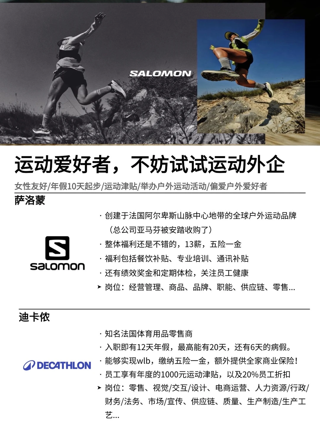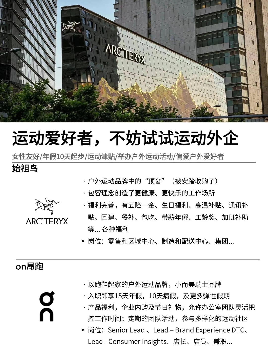 这两年运动户外的风真的很大!想进外企的可以考虑下这部分,各家的业务发展的都很好,对女生也很友好,像办公室常规岗位、门店招聘要求不高的岗位都有… . 为什么试试户外运动外企? 🏃🏻适合年轻人,人性化、氛围也很好 🏃🏻假期丰富,年假基本上都是12天起步的 🏃🏻经常举户外运动活动,还可以拿运动津贴 · 坚持日更✊🏻,帮大家在找工作路上顺利拿 offer!
