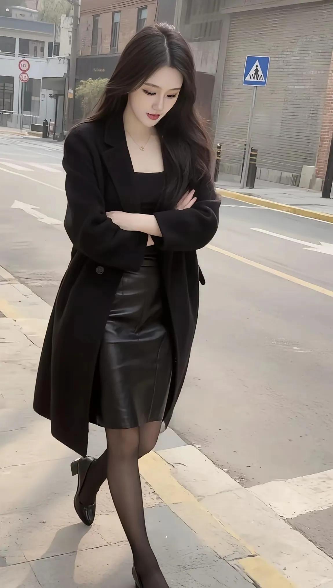 都市女郎的时尚穿搭,黑色皮裙与大衣的搭配,尽显优雅与自信。