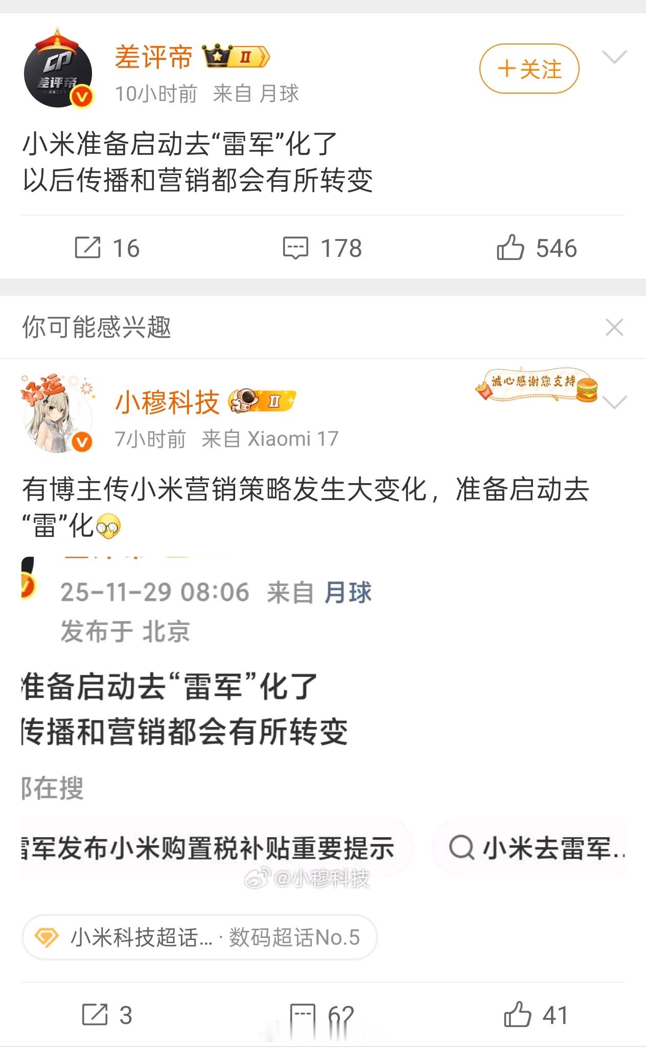 有人说小米在减少雷军对传播营销的影响计划,我觉得确实也对,近期的车展也没有参加,雷军说的任何话都可以被抓字眼、放大影响,如果换成米粉、kol进行传播,基本上可以减少这部分对品牌的伤害,因为很多人对雷军的针对性特别强。大v聊车