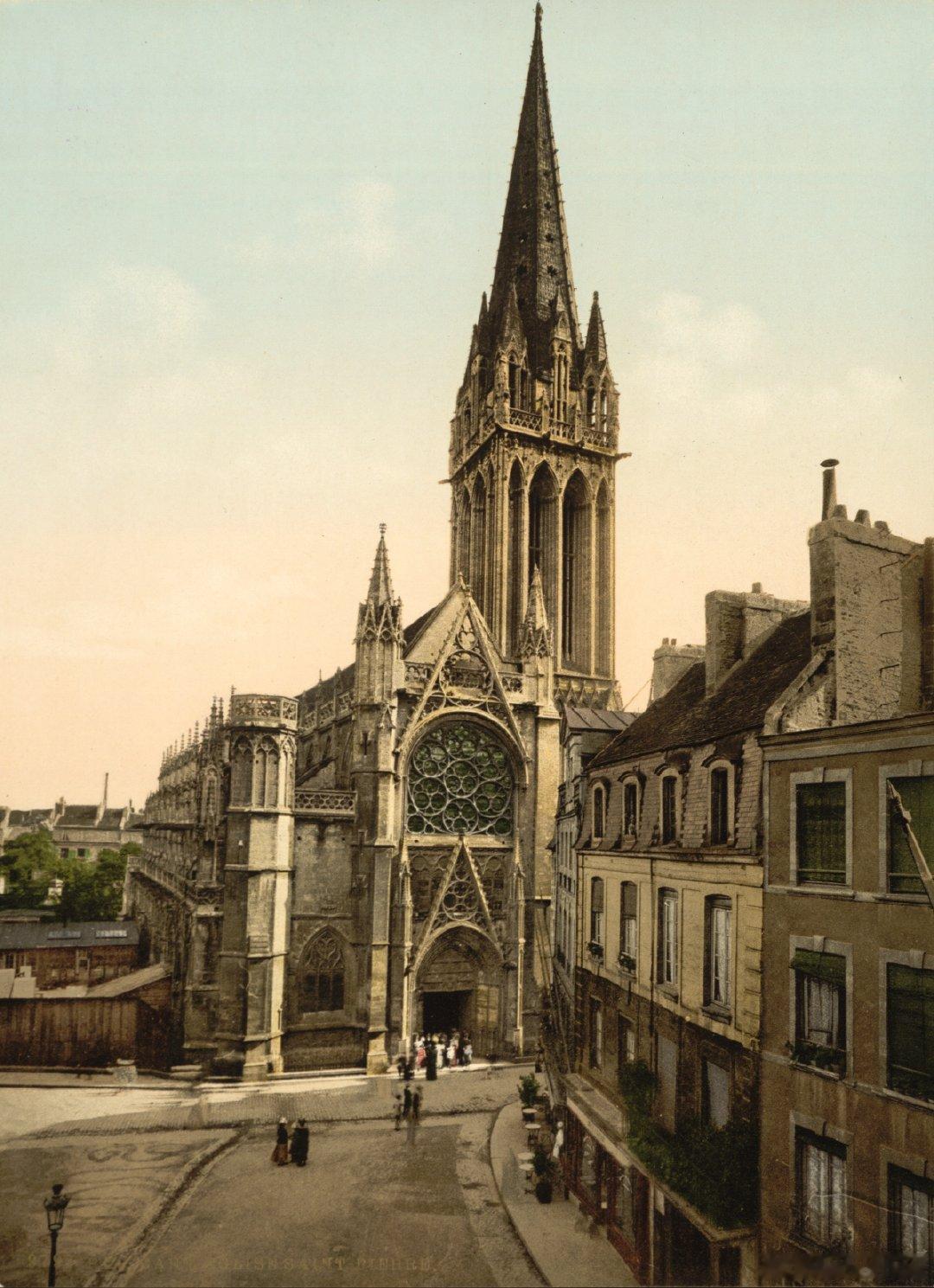 历史知识 法国诺曼底历史名城卡昂的地标之一——圣彼得大教堂,完工于1518年,典型哥特式建筑。照片拍摄于19世纪末,后期上色。