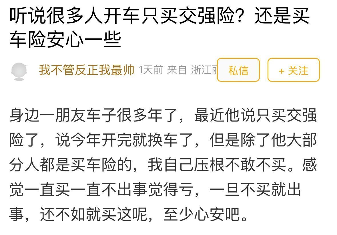 宁波车主问买了交强险就不买商业险可行吗 ?宁波一车主买了交强险就不买商业险!网友吵翻:碰到事了就知道了!宁波网友身边朋友关于车险的看法。该朋友今年只打算买交强险,他的想法很简单,觉得车子都这么老了,没必要再花那么多钱买商业险。持这样观念的网友还不少,有一位网友直言不讳地说:商业保险真没啥用,保险条款极其霸强。大家觉得该不该买商业险?来源:东方热线同城热点创作计划