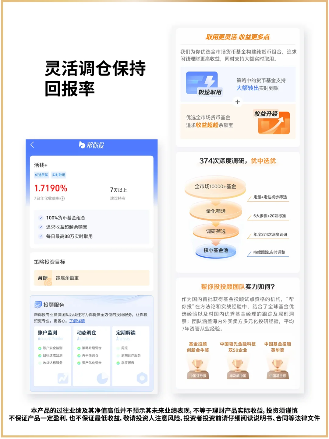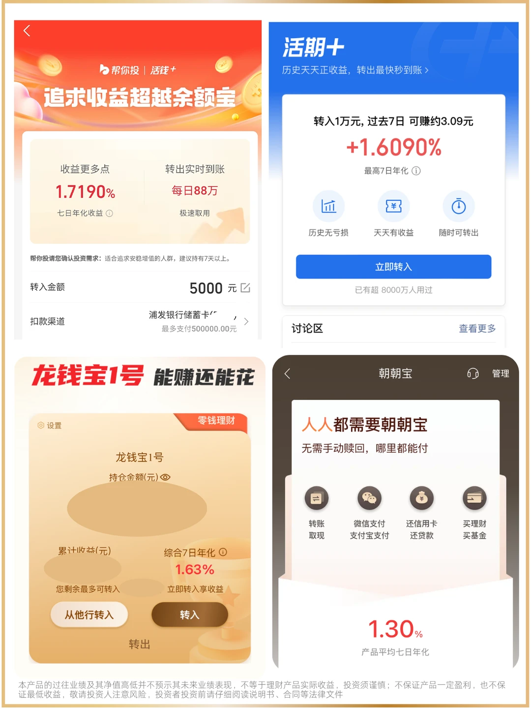 这几天做了点功课,梳理对比了市场上的主流相关产品,同学们可以酌情参考。我最近才知道的“帮你投”(蚂蚁集团旗下基金投顾业务)的王牌产品“活钱➕”,感觉还不错,准备多挪点闲置资金来薅羊毛:7日年化收益率有1.72%