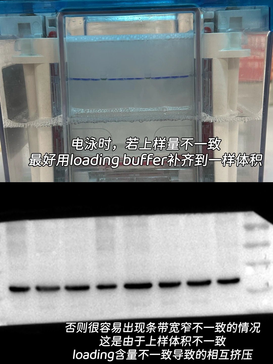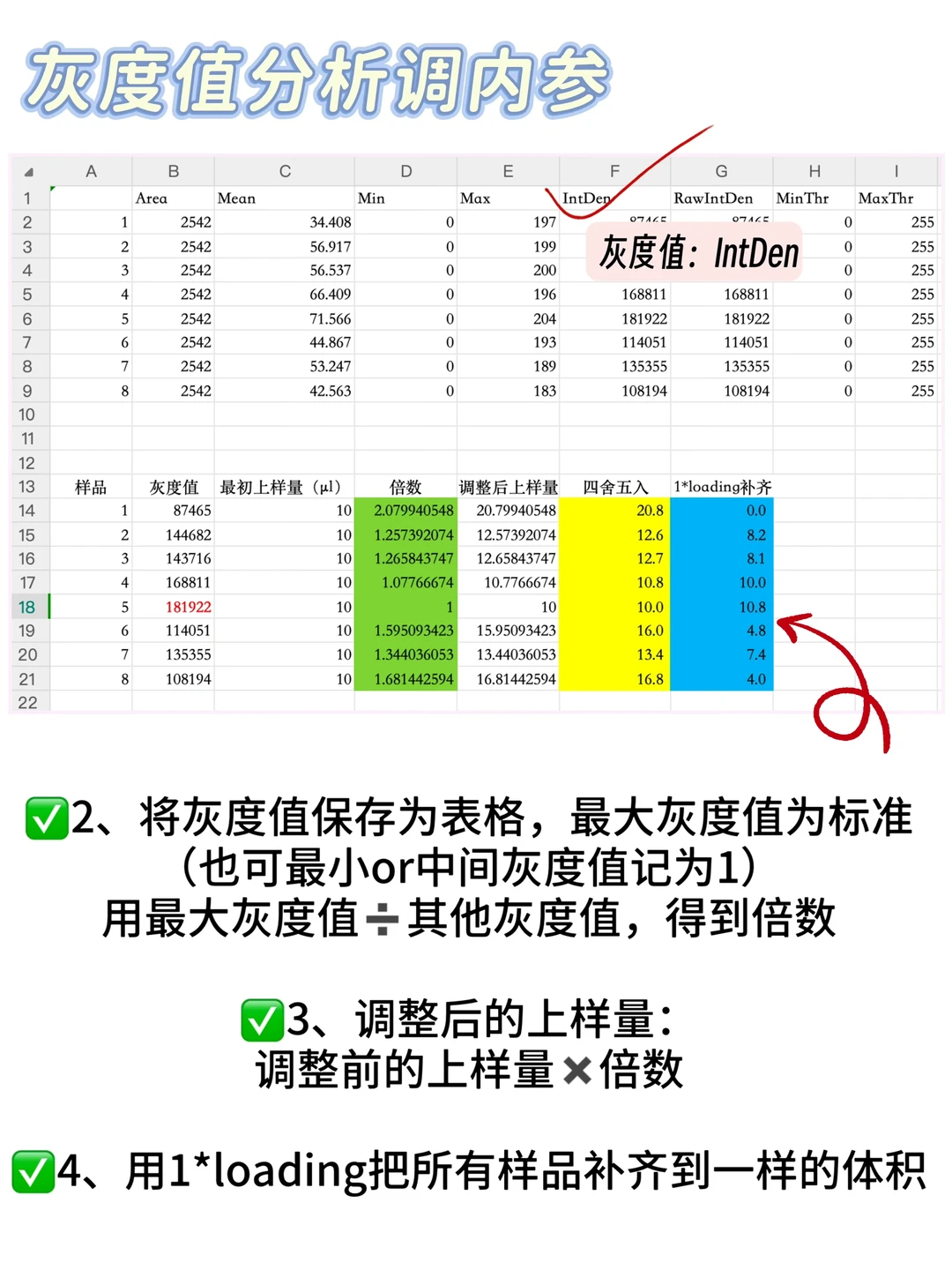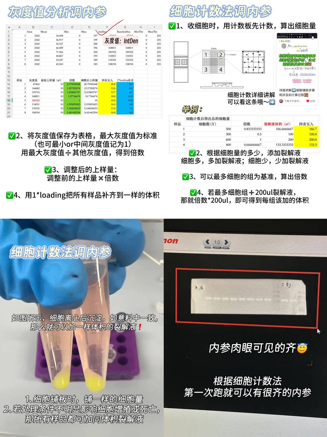 先跑一次电泳得到初始条带,把条带导入ImageJ计算灰度值,以最大灰度值为基准(最小灰度值也可以),算出倍数,然后用初始上样量✖️倍数就行,详细计算方法在P2和P3~