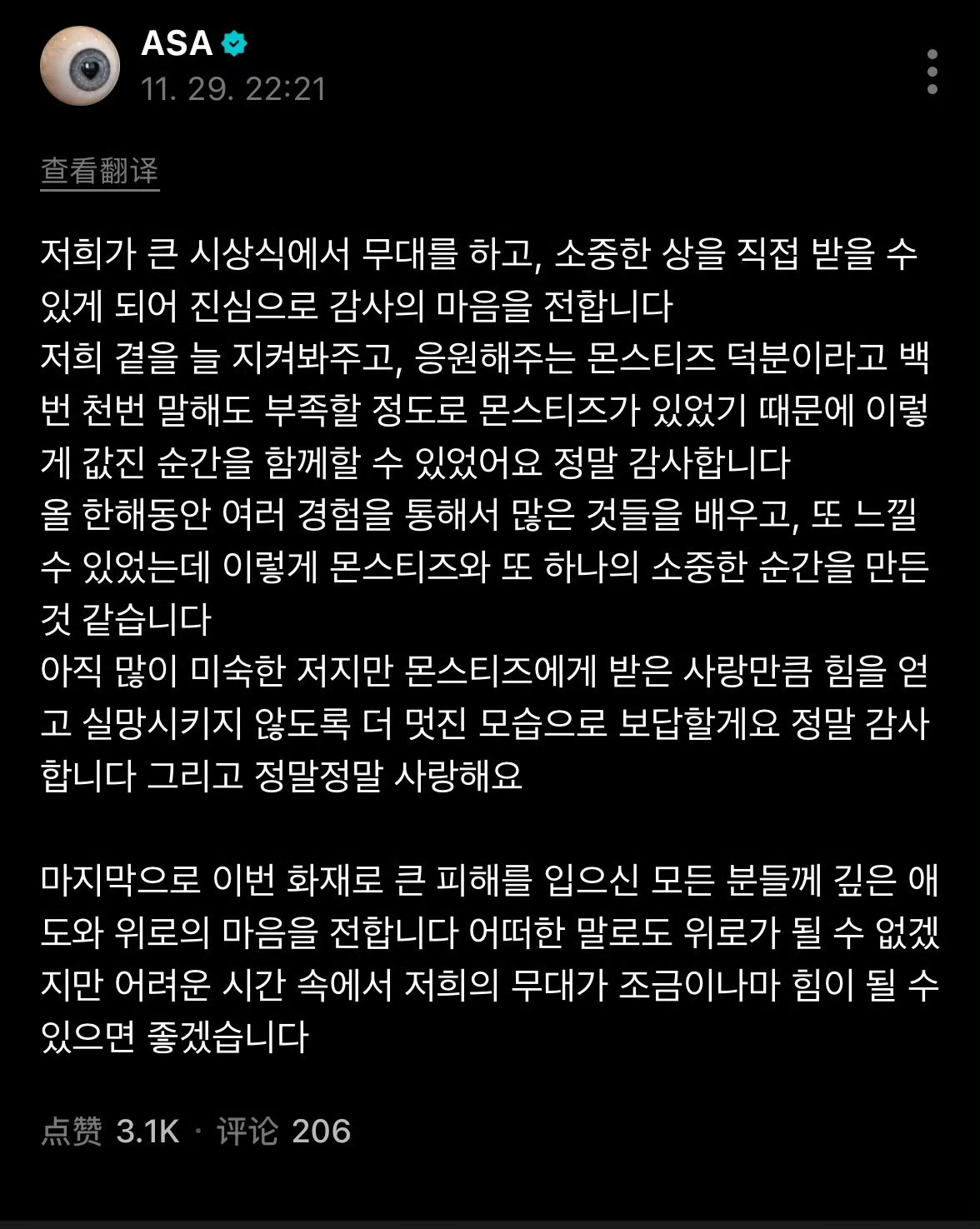 今晚在wvs写长文对粉丝表达感谢,同时也对中国香港受灾的同胞安慰的ASA🫶🏻