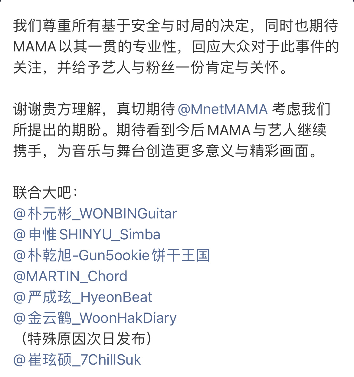 MAMA合作舞台被取消 因MAMA合作舞台突然取消现在大吧已经联合发文🔖朴元彬 申惟 朴乾旭 马丁 严成玹 金云鹤 崔玹硕