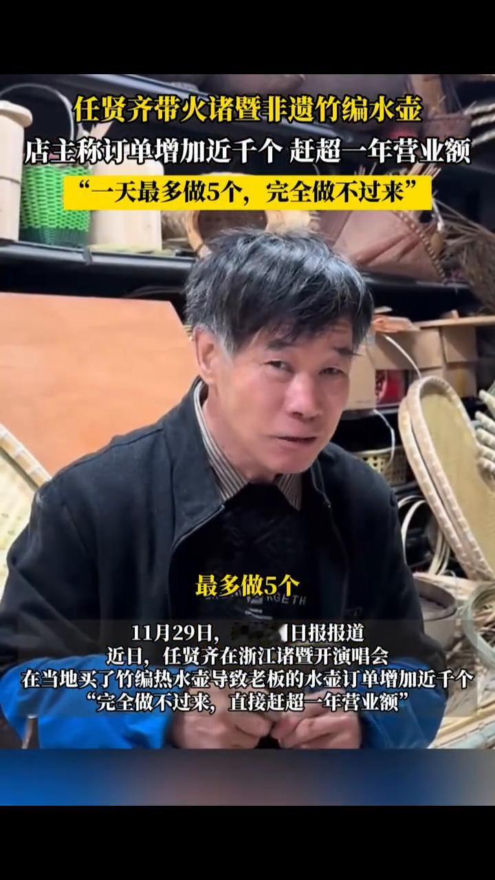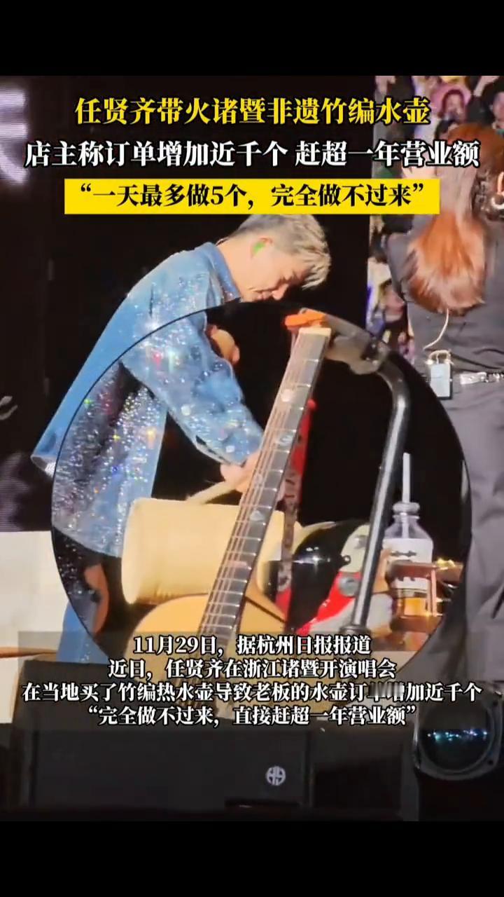 任贤齐带火诸暨非遗竹编水壶,店主称订单增加近千个,赶超一年营业额。 11月29日,据杭州日报报道,近日任贤齐在浙江诸暨开演唱会,在当地买了竹编热水壶导致老板的水壶订单增加近千个。 "一天最多做5个,完全做不过来"。 最多做5个,一下子肯定要有了。 每天(有顾客)电话打来。 任贤齐,1966年6月出生于台湾省,中国台湾歌、影、视三栖艺人。1990年发行音乐合辑《奔向彩虹》出道,1996年凭借《心太软》迅速走红,代表作品有《对面的女孩看过来》、《伤心太平洋》等。
