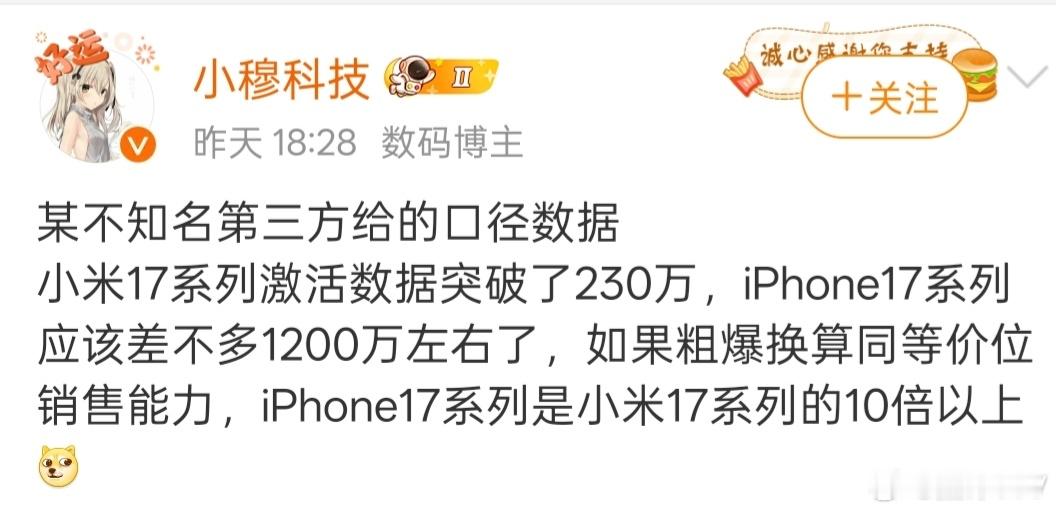 现在真是阿猫阿狗都能够做数码博主了,他说小米17系列激活数据突破230万,iPhone17系列突破1200万,然后简单粗暴的得出iPhone17系列的激活量是小米17系列的10倍以上,这种人也能够做数码博主,实在是服了。