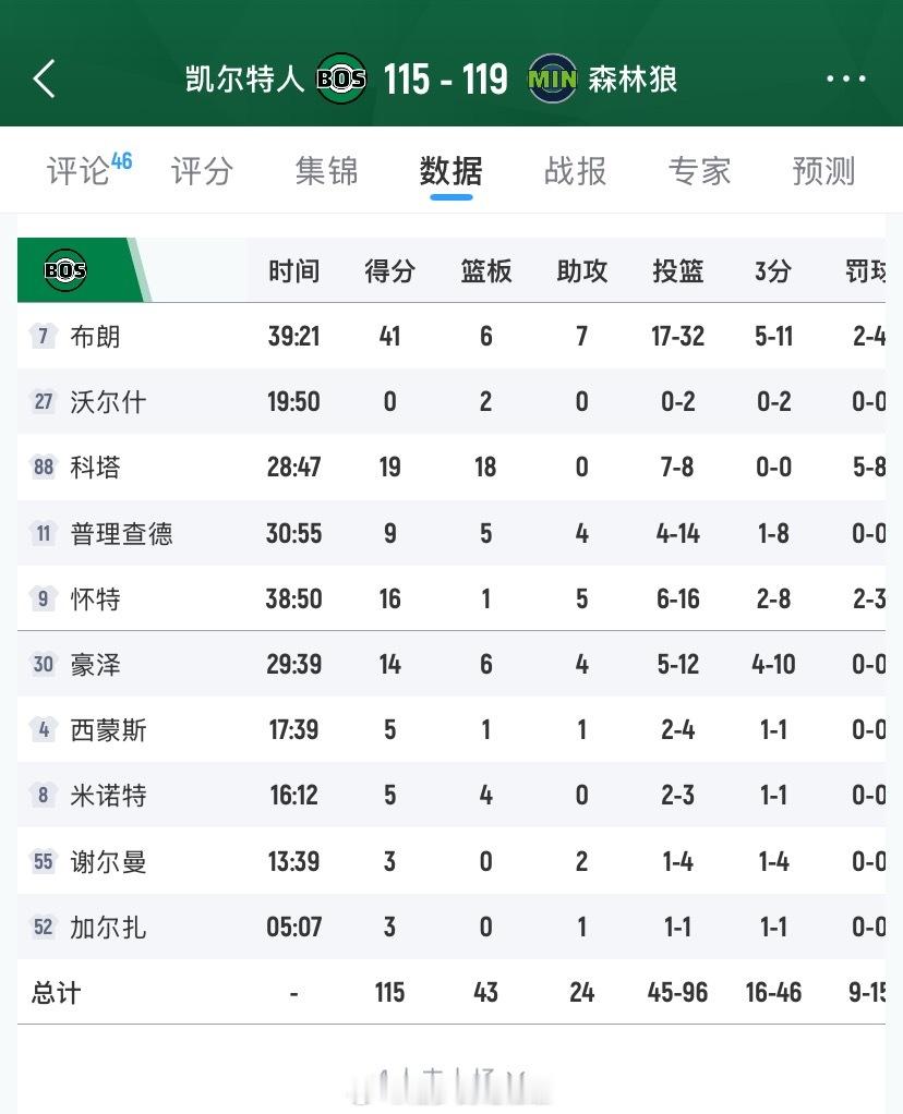 凯尔特人115-119不敌森林狼,目前10胜9负。杰伦-布朗41分6篮板7助攻5抢断尼米亚斯-克塔19分18篮板2盖帽;德里克-怀特16分5助攻2盖帽萨姆-豪瑟14分6篮板4助攻佩顿-普里查德9分5篮板4助攻约什-米诺特5分4篮板安芬尼-西蒙斯5分