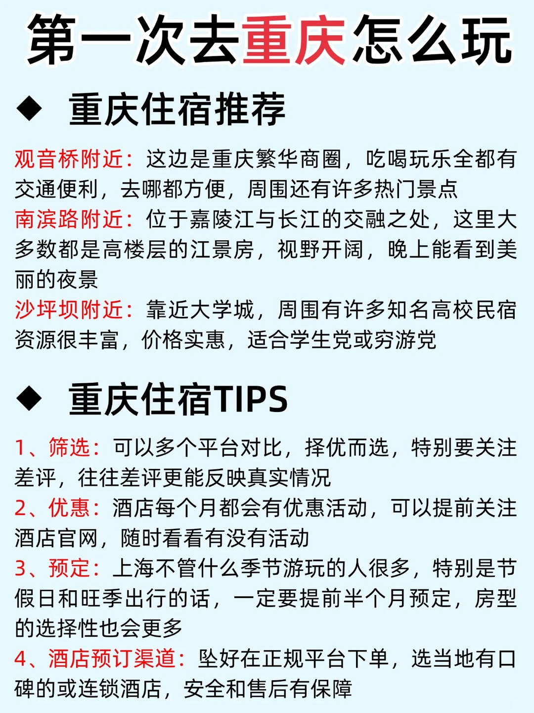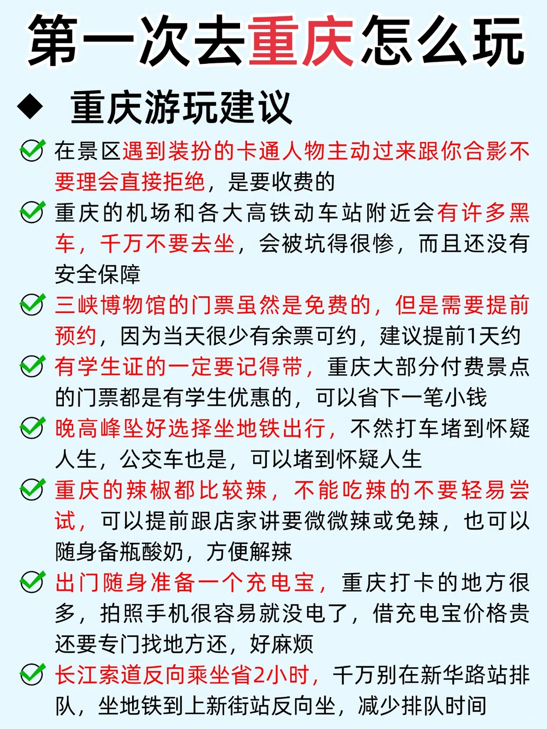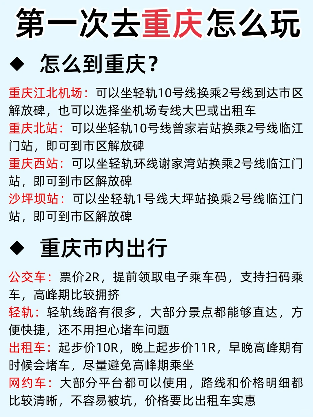1️⃣重庆轻轨线路多,出行乘坐轻轨很方便,不建议打车,容易堵车且打车贵,非必要不建议