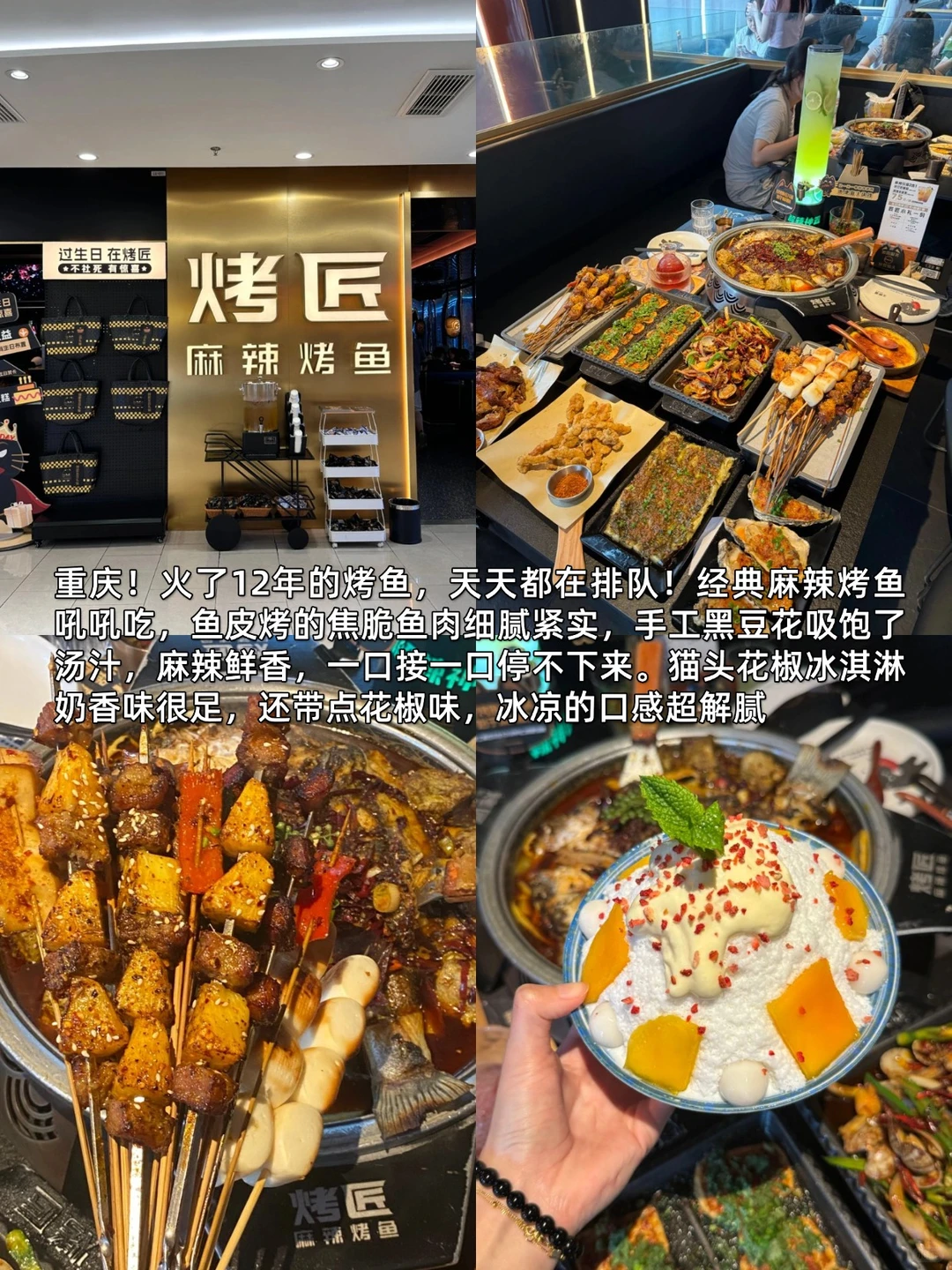 🥢烤匠麻辣烤鱼(观音桥大融城店):火了12年的重庆烤鱼,经典麻辣烤鱼吼吼吃,鱼皮烤的焦脆、鱼肉细腻紧实,手工黑豆花吸饱了汤汁,麻辣鲜香
