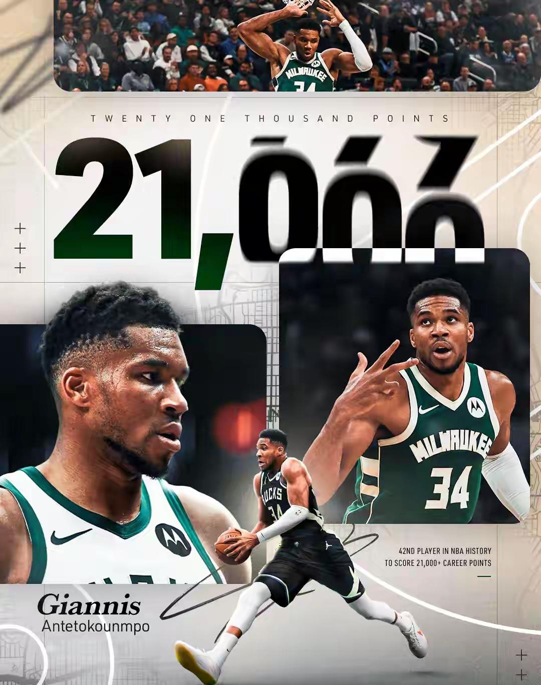 希腊怪兽果然名不虚传 出场19分钟便砍下29分8板 也就是一节半的出场时间 30岁的黄金年龄 解锁21000分大关 突破3万分应该没问题 如果待在雄鹿保持健康 甚至可以冲击一下4万分了 不过这个难度确实太大了 同时也可以看出詹姆斯真的是非人类