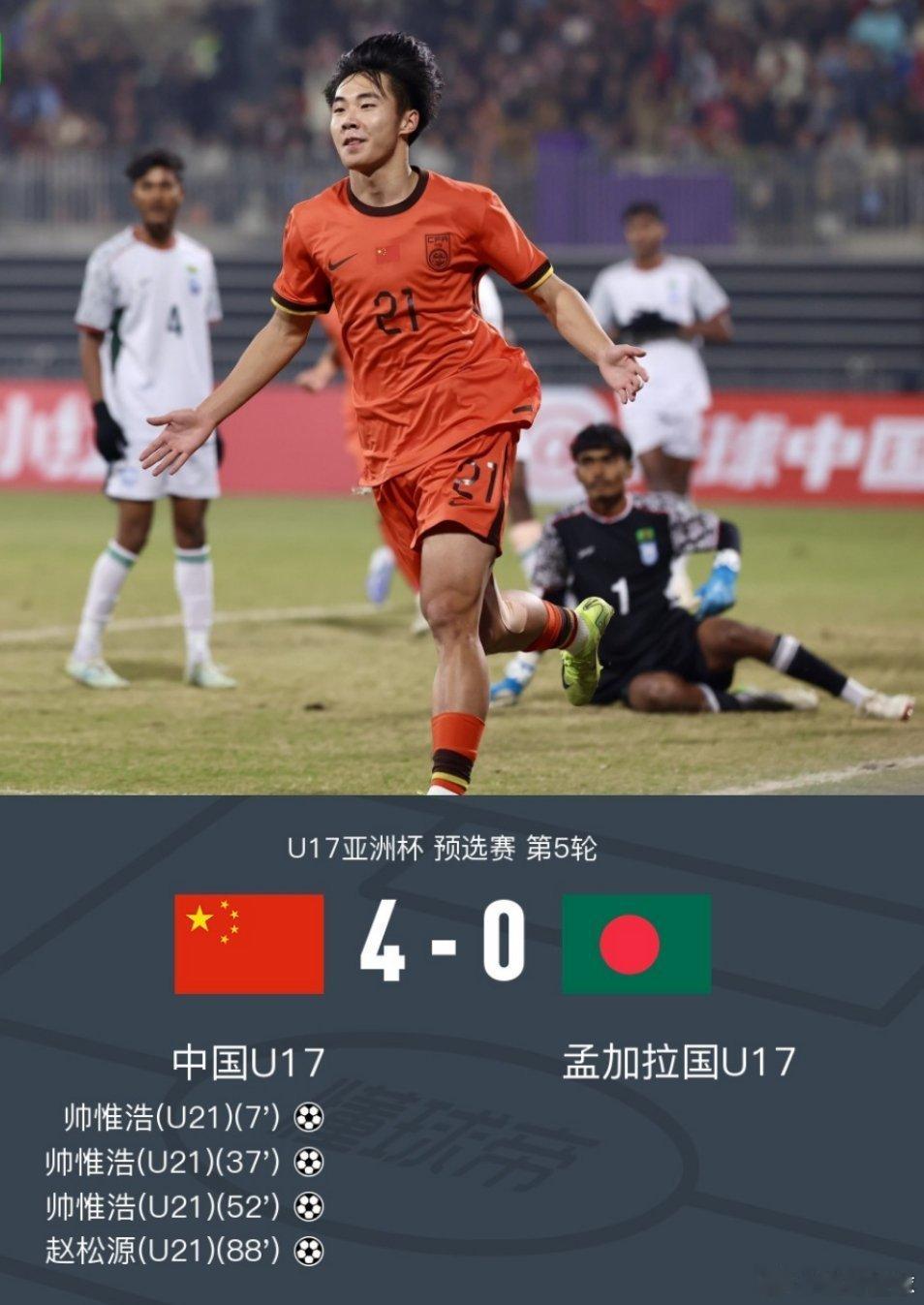 u17中国4-0孟加拉足球 U17亚预赛:国少4-0孟加拉国进正赛,帅惟浩戴帽,赵松源破门。北京时间11月30日U17亚洲杯 预选赛 第5轮,中国U17对阵孟加拉国U17。中国U17帅惟浩帽子戏法,赵松源破门。最终比分中国U17 4-0 孟加拉国U17。