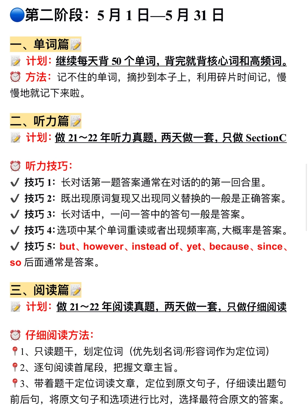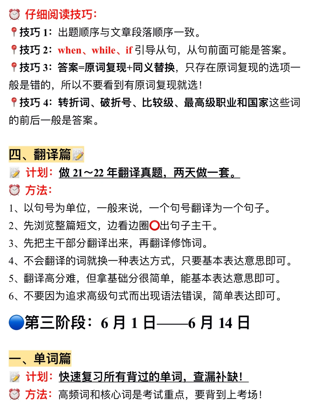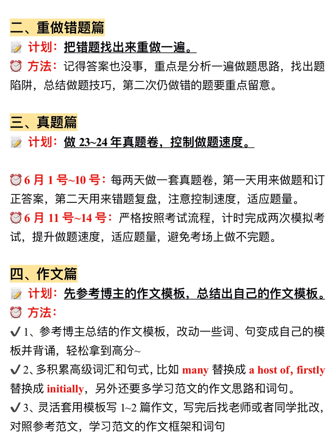 ⏰ 6月1号~10号:每两天做一套真题卷,第一天用来做题和订正答案,第二天用来错题复盘,注意控制速度,适应题量。
