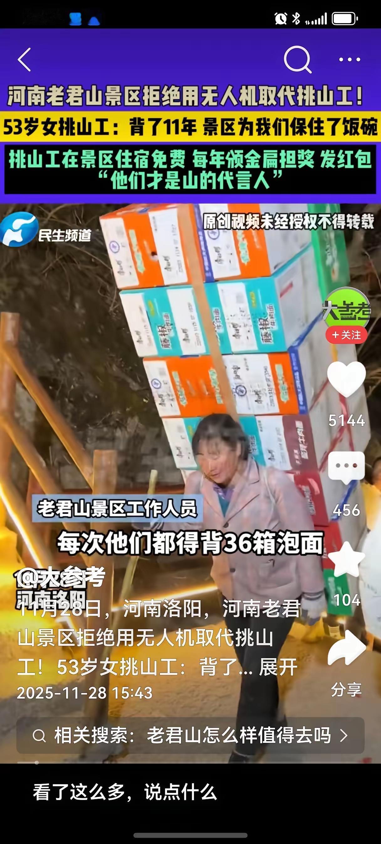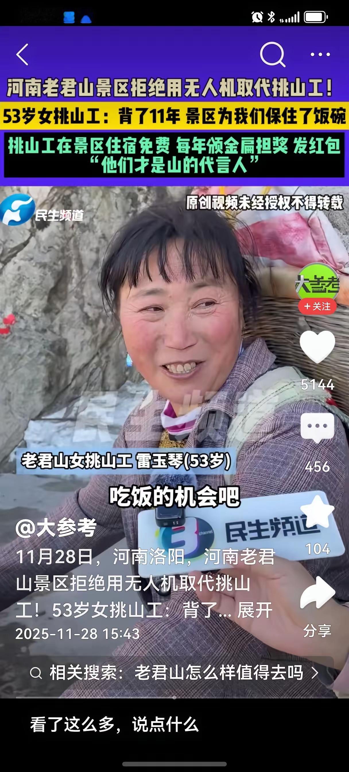 有游客反应,用无人机运输货物上山,既可减轻挑山工负担,又可降低山顶物品的价格。11月28,河山老君山景区回应称,不会使用无人机,挑山工才是景区的代言人。 面对记者的采访,53岁的挑山工雷玉琴身背比自己还高的货物,满脸笑意的说,感谢景区保住了我们的饭碗 有网友说机器人解决的是人类干不了或者高危的行业,而不是跟普通人抢饭碗 又有网友说科技进步的根本意义就在于促进生产力,把人类从繁重艰苦的工作中解放出来。现在不用无人机看似照顾了挑山工的生计,实则属于权宜之计,将来迟早还是要用的! 个人觉得挑山工真的太辛苦了,这些岗位真的可以取代,人们可以去做保洁,家政等等。这样比较轻松收入也高些。长期背重物爬山对我们身体造成的伤害不是一点钱就能解决的,我妈年轻时候就爬坡去地里背红薯,一天三趟,现在脚的膝盖都坏了站不起来。与鸿蒙共赴星光之约无人机挑山工