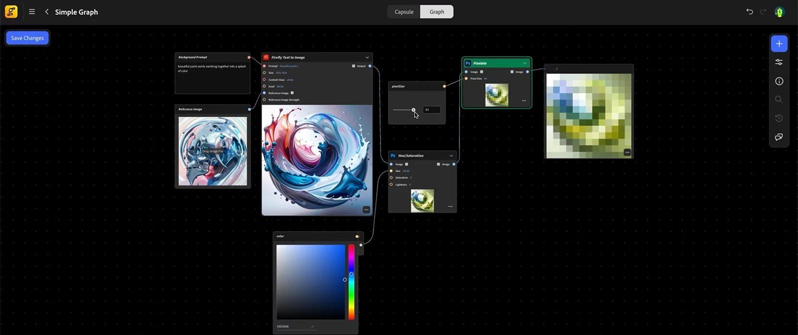 真来了!我们常喊的Adobe全家桶...我们总是戏称 Adobe 为「全家桶」,毕竟它涵盖了设计的方方面面。但说实话,这桶水其实是「漏」的——为了实现一个简单的创意效果,你往往得在 Illustrator 里画形,去 Photoshop 里修色,再到 After Effects 里加动效。这种名不符实的断裂感,把我们的时间都耗在了软件切换的 Alt-Tab 上。 这一情况将迎来终结,Adobe 近期推出的 Project Graph,这是一款AI 驱动的工作流创意工具,通过可视化节点编辑器,你可以把Adobe旗下所有软件作为工作流的某个节点。通过一个工作流解决所有问题。 不需要启动 Photoshop,只需在搜索栏输入指令,就能直接抓取 PS 的「像素化」滤镜;不需要打开 Firefly 网页版,就能直接拖拽出 AI 生图模块。 曾经割裂在不同图标里的功能,现在变成了画布上一个个平等的、可随意串联的节点(Nodes)。从输入参考图,到 AI 生成,再到后期调色,整个全家桶的能力被拆解成了原子级的积木,通过连线即可无缝数据流转。最后,这一团复杂的逻辑网还能被一键封装成胶囊(Capsule)——一个只有核心滑块的简洁面板。这彻底改变了做个效果要切三个软件的旧状,让整个Adobe全家桶 真正变成了一个随取随用的庞大工具库。