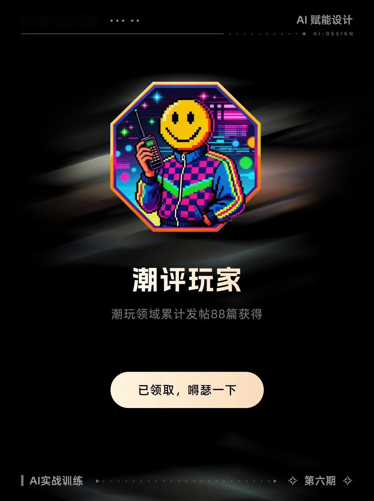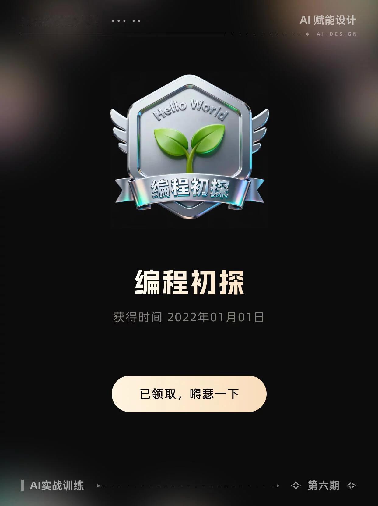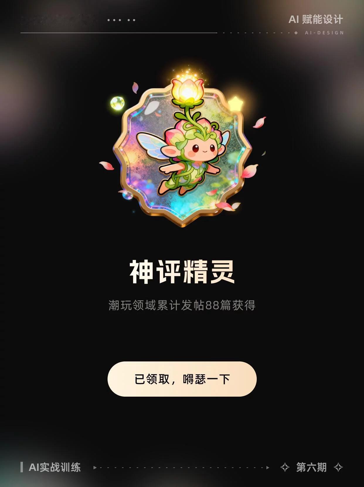 ai创造营 AI给我灵感!解锁勋章设计的1001种可能(附提示词)AI 在风格探索阶段具有无可比拟的优势,能在短时间内提供大量视觉方向,极大拓宽了设计可能性。我已经替大家进行了一次勋章风格探索实验了。🎯 实验目标:用AI快速探索不同艺术风格的勋章设计🔧 实验方法:通过切换风格关键词,生成多样化方案:1️⃣ 卡通3D风:卡通 3D 立体图标,色彩清新柔和,三个卡通立体勋章,主体都是风格相同的黄色拟人化表情符号:第一个神态懵懂好奇,戴着蓝色领结,小手平放在前面,脸颊带腮红,蓝色六变形外框,周围点缀小云朵和细碎星光,绿色矩形底框,白色卡通加粗字体“神评萌新”,字体卡通醒目,笔触圆润,光影柔和,充满新手的天真感;第二个神态英气,嘴角邪魅上扬,武侠风融合趣味感,手拿键盘头戴斗笠(斗笠极小迷你,手小,头大),身披棕色短披风,橙色带纹理凸起的六边形外框,周围点缀小云朵和细碎星光,蓝色矩形底框,白色卡通加粗字体 “神评侠客” ,字体卡通醒目,笔触圆润,光影柔和,整体保留圆润质感与立体光影,强化武侠元素的灵动性;第三个神态睿智从容,白发白胡须,双眼微眯,不要出现耳朵,手持玉如意,头顶有复古官帽装饰(帽子极小迷你),紫色带祥云纹理的六边形外框,周围点缀小云朵和细碎星光,金色矩形底框,白色卡通加粗字体 “神评泰斗” ,字体卡通醒目,笔触圆润,光影柔和,整体光影细腻有层次,元素凸显泰斗的资深与智慧感。2️⃣ 金属立体风:一个银色金属立体等级徽章,带有小翅膀的六边圆角形的徽章,中间有一颗两个叶子的绿色嫩芽,背后小英文"Hello World",下方丝带标注 “编程初探” 立体字,漫射光,整体风格简约却不失科技感,渐变质感,线条柔和无尖锐棱角,高清细节3️⃣ 梦幻精灵风:成就勋章设计,由花朵、藤蔓融合而成的可爱拟人表情,头顶绽放发光花苞,长着可爱小翅膀,45°飞翔姿势,绚丽磨砂玻璃质感勋章背景框,周围漂浮这发光物,和飘落的花瓣,奇幻卡通童话风,生物拟态 + 梦幻元素,色彩明亮丰富,整体色彩梦幻柔和,充满童话秘境的奇幻感,黑色背景4️⃣ 蒸汽波复古风:蒸汽波复古风潮评玩家勋章设计,像素化的复古笑脸符号,身穿霓虹格纹复古运动服,手持老式对讲机,复古八边形形状背景外框,内部闪烁着 VHS 故障纹理和彩色光斑,蒸汽波复古风,复古元素 + 迷幻色彩,整体色彩迷幻冲突,充满复古未来主义的荒诞创意,黑色背景案例虽少,但是万变不离其宗,相信聪明的你一定能学会。
